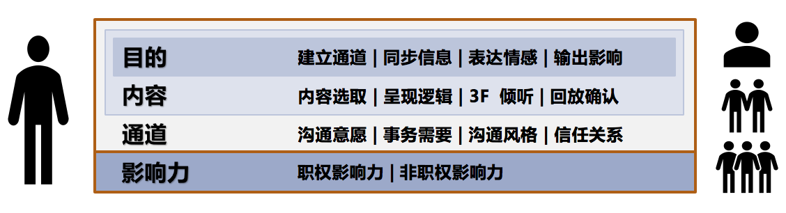 从上、下两个红框可以看出,这个框架主要分为上、下两个部分:上面的部分是由“目的”“内容”和“通道”三个部分套在一起组成的,属于“沟通”的主体部分;而下面是“影响力”部分。为什么要这么分呢?那我们具体来说说。