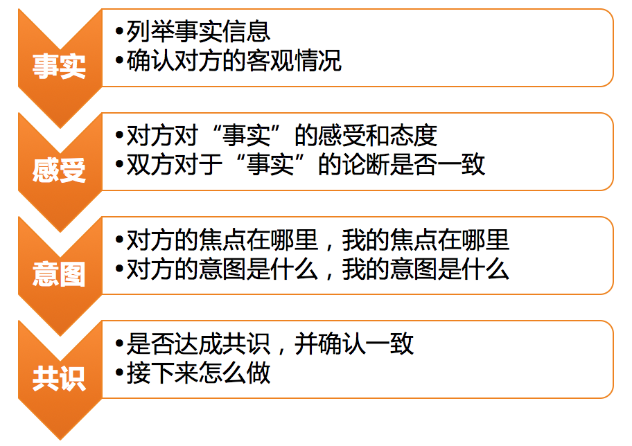 第一,事实信息(FACT)。即,对方说了哪些事实性信息?和你掌握的信息相比有没有什么不同?这是沟通的第一层,也是最基础的一层。如果双方连基本的事实信息都不一致,达成有效的沟通结果就无从谈起了。