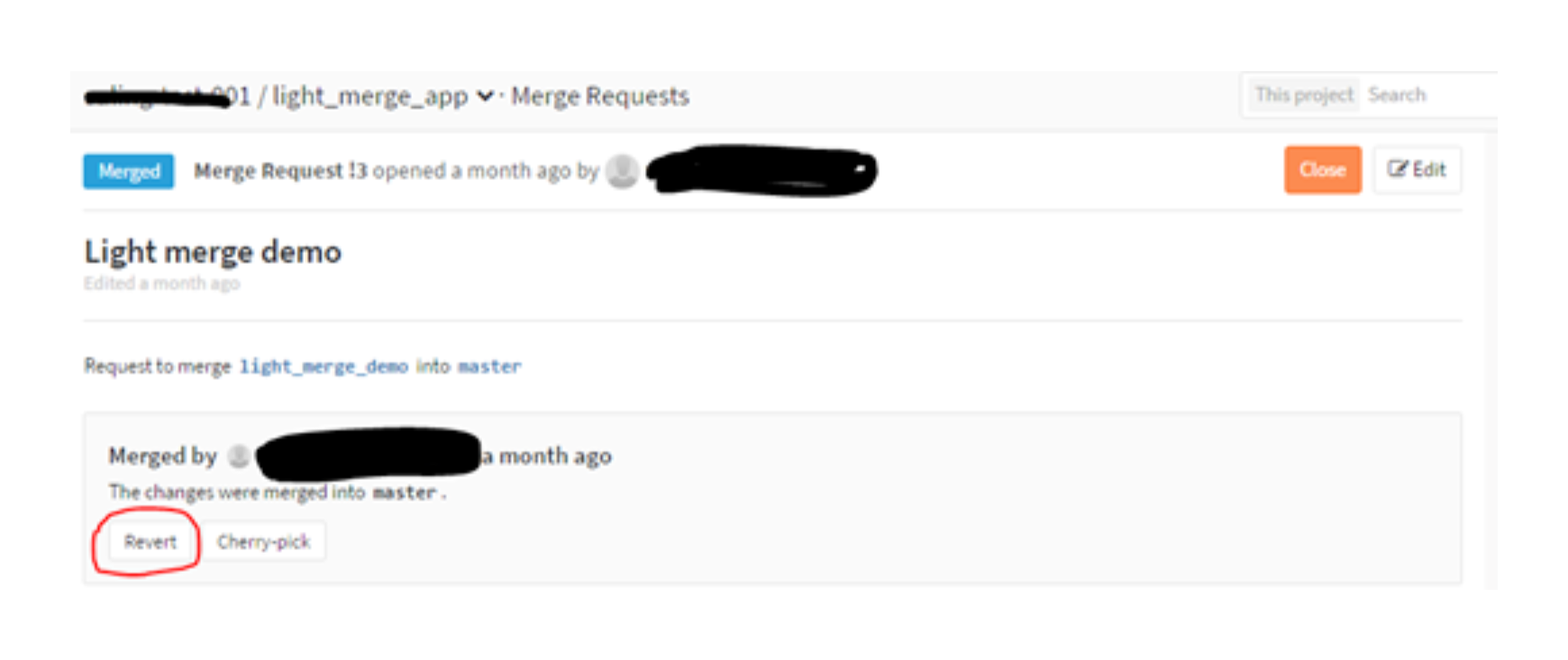 团队成员可以在 GitLab 上找到C4和C6合入master的合并请求,然后点击 revert 。如图4所示。