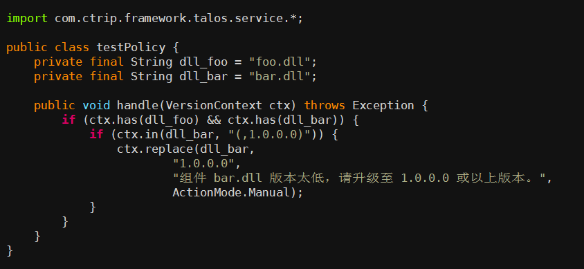 该逻辑的含义是: 当项目的依赖存在 foo.dll 和 bar.dll 时,bar.dll 的版本号必须大于 1.0.0.0。看, 是不是非常方便快捷通用!