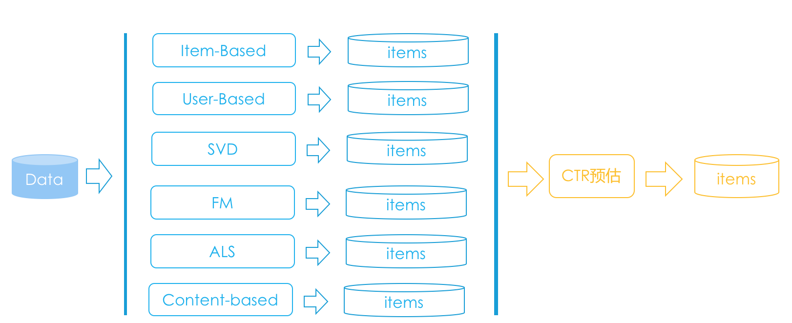 在召回阶段,其实就是各种简单的、复杂的推荐算法,比如说基于内容的推荐,会产生一些推荐结果,比如基于物品的协同过滤会产生一些结果,矩阵分解会产生一些结果,等等。