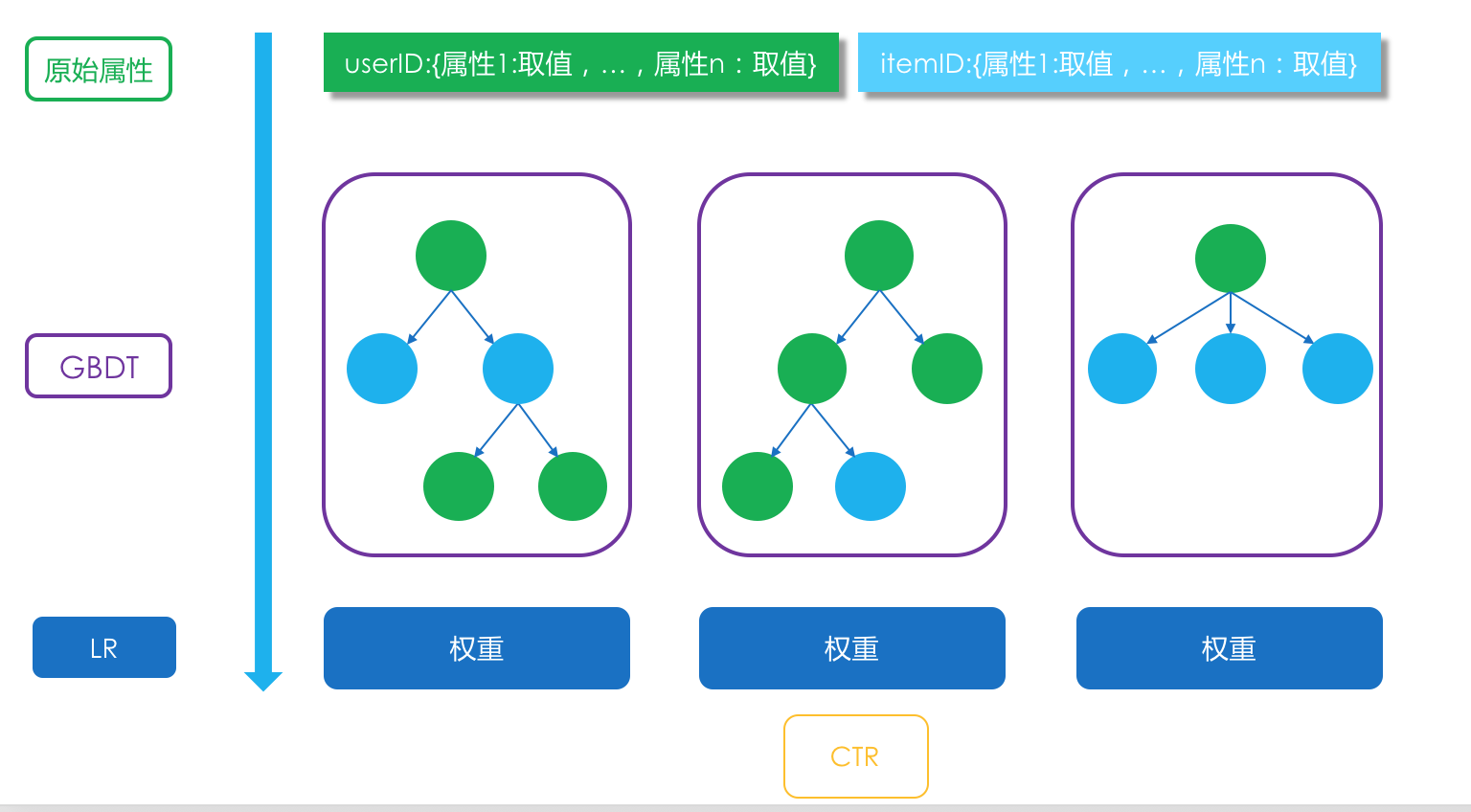 在推荐系统的模型融合阶段,就要以产品目标为导向。举个简单的例子,信息流推荐,如果以提高CTR为目标,则融合模型就要把预估CTR作为本职工作,这个工作谁最能胜任呢,一直以来就是逻辑回归。