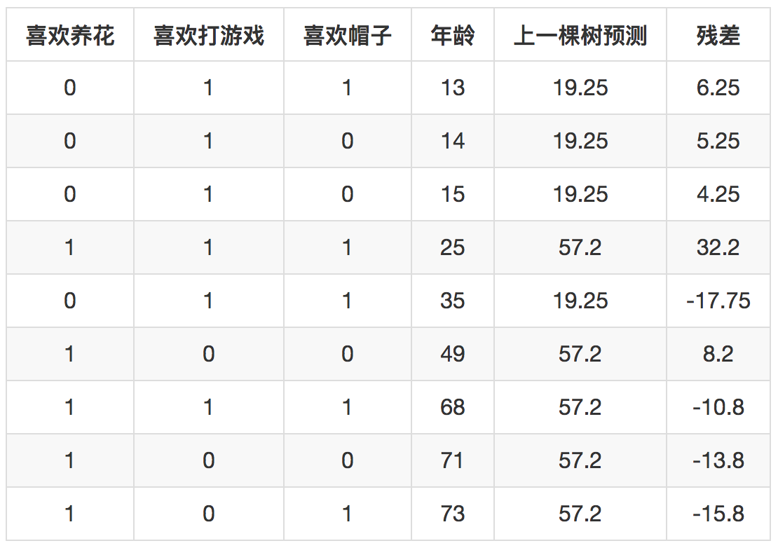 接下来第二棵树如何生成呢?这里就体现出GBDT和其他提升算法的不同之处了,比如和Ada boost算法不同之处,GBDT用上一棵树去预测所有样本,得到每一个样本的残差,下一棵树不是去拟合样本的目标值,而是去拟合上一棵树的残差。这里,就是去拟合下面这个表格。