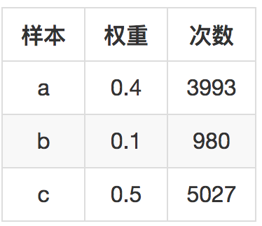 模拟10000次后,三个样本被采样次数如下: