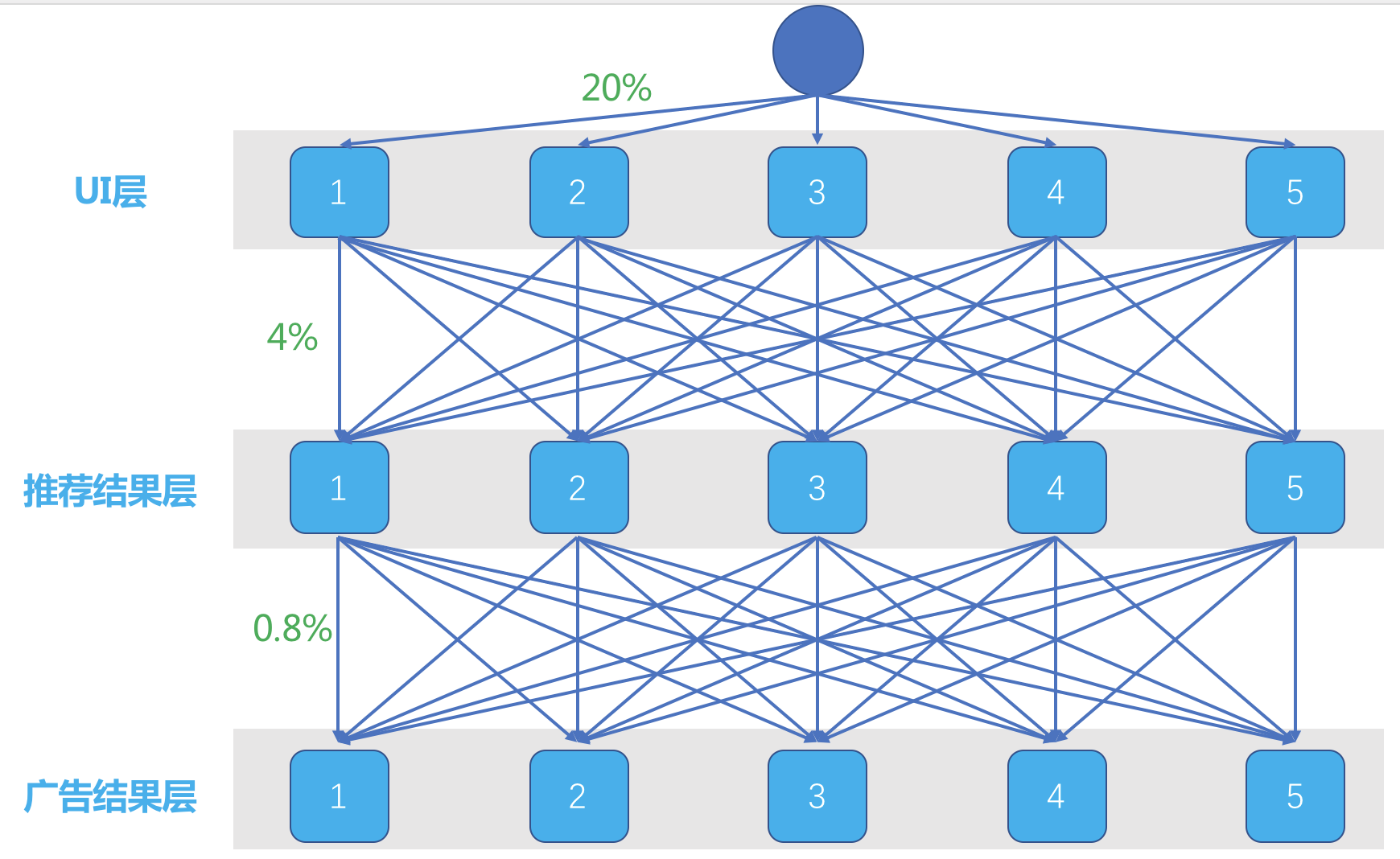 每一个桶均匀得到20%的流量。每一个桶里面已经决定好了为你展示什么样的UI,流量继续往下走。每一个桶的流量接着依然面对随机进入下一层实验的5个桶之一,原来每个桶的20%流量都被均分成5份,每个桶都有4%的流量进入到第二层的每个桶。