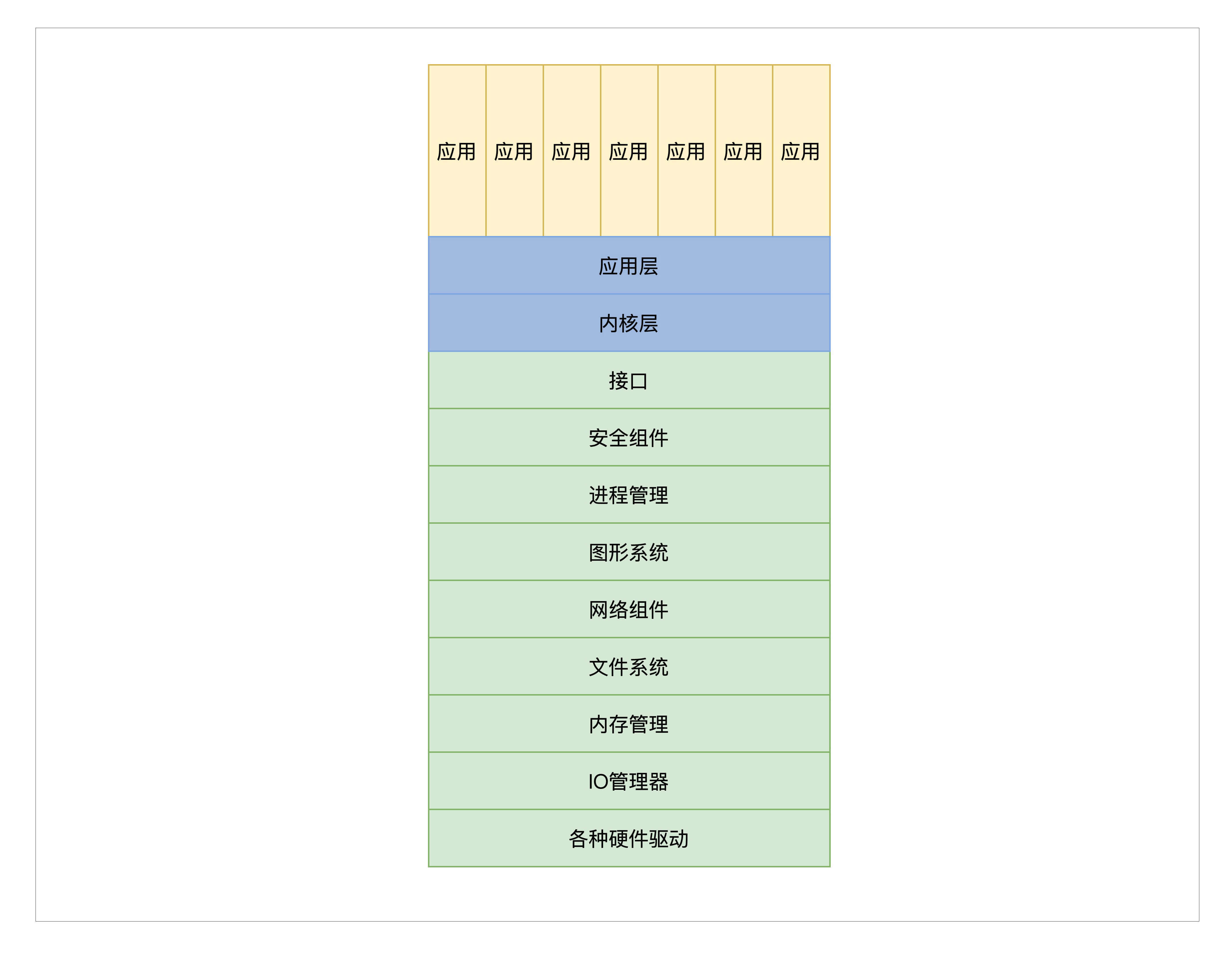 如果上述文字让你看得头晕,我们来画幅图,可能就会好很多,如下所示,当然这里没有画出用户空间的应用进程,API接口以下的为内核空间,这才是设计、开发内核的重点。