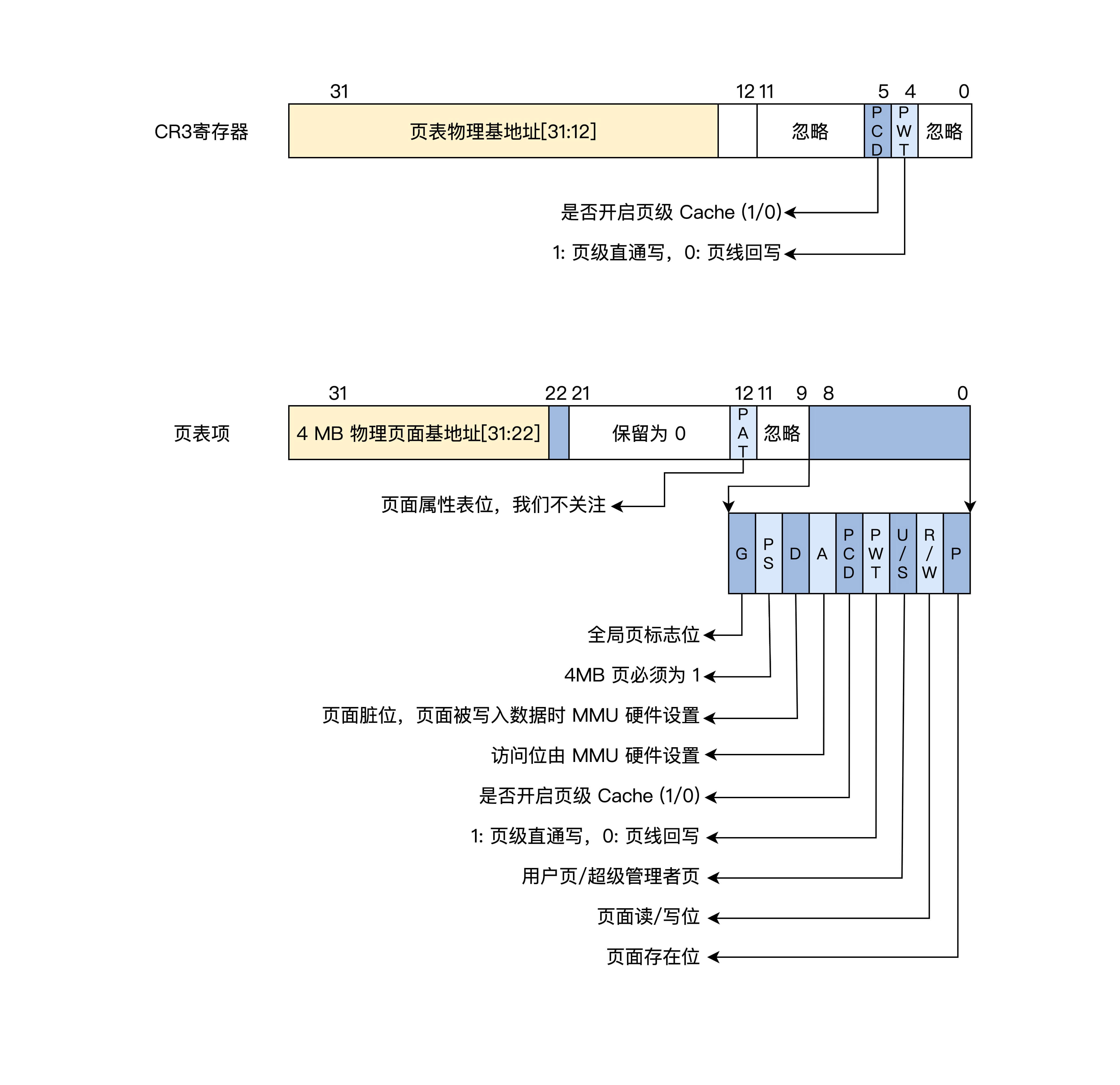 可以发现,4MB大小的页面下,页表项还是4字节32位,但只需要用高10位来保存物理页面的基地址就可以。因为每个物理页面都是4MB,所以低22位始终为0,为了兼容4MB页表项低8位和4KB页表项一样,只不过第7位变成了PS位,且必须为1,而PAT位移到了12位。