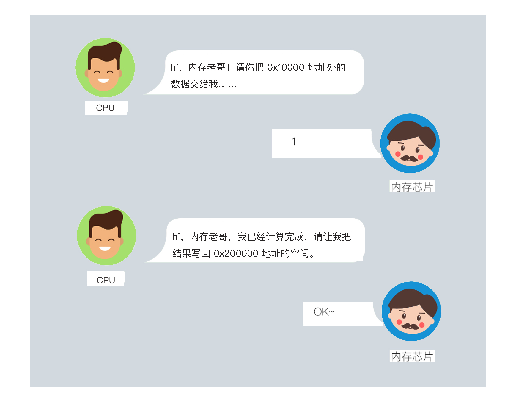 读取指令、读写数据都需要首先告诉内存芯片:hi,内存老哥请你把0x10000地址处的数据交给我……hi,内存老哥,我已经计算完成,请让我把结果写回0x200000地址的空间。这些地址存在于代码指令字段后的常数,或者存在于某个寄存器中。
