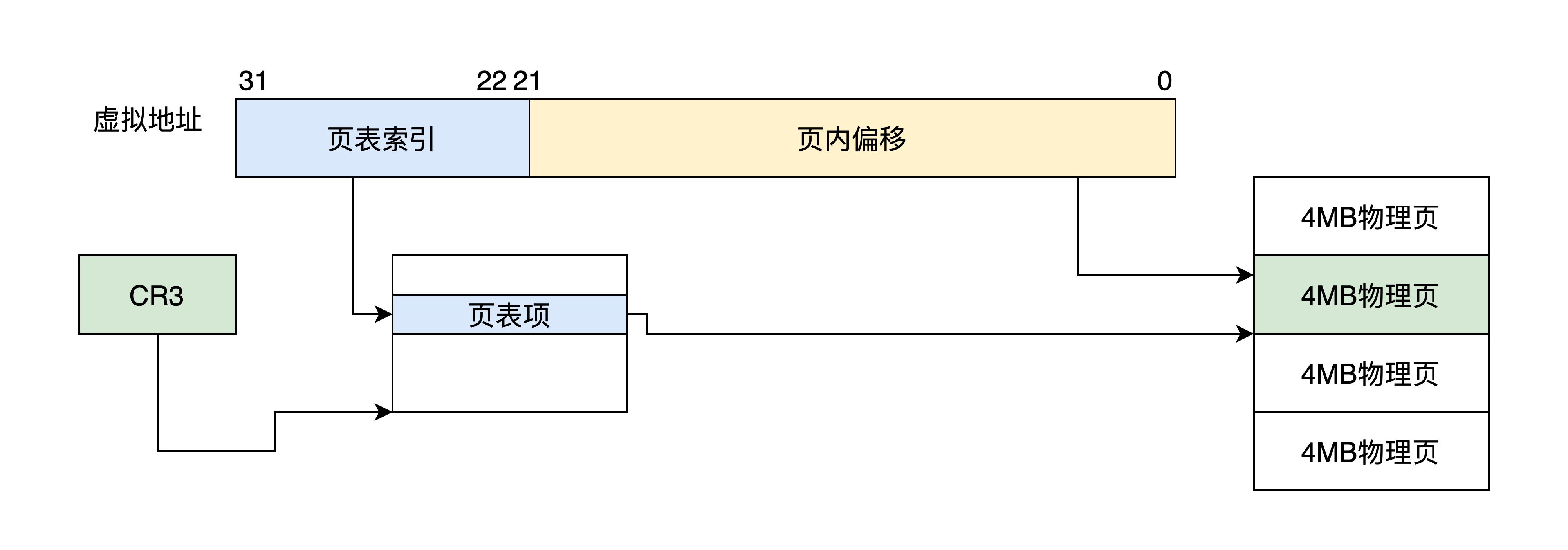 该分页方式下,32位虚拟地址被分为两个位段:页表索引、页内偏移,只有一级页目录,其中包含1024个条目。其中一个条目指向一个物理页,每个物理页4MB,正好为4GB地址空间,如下图所示。