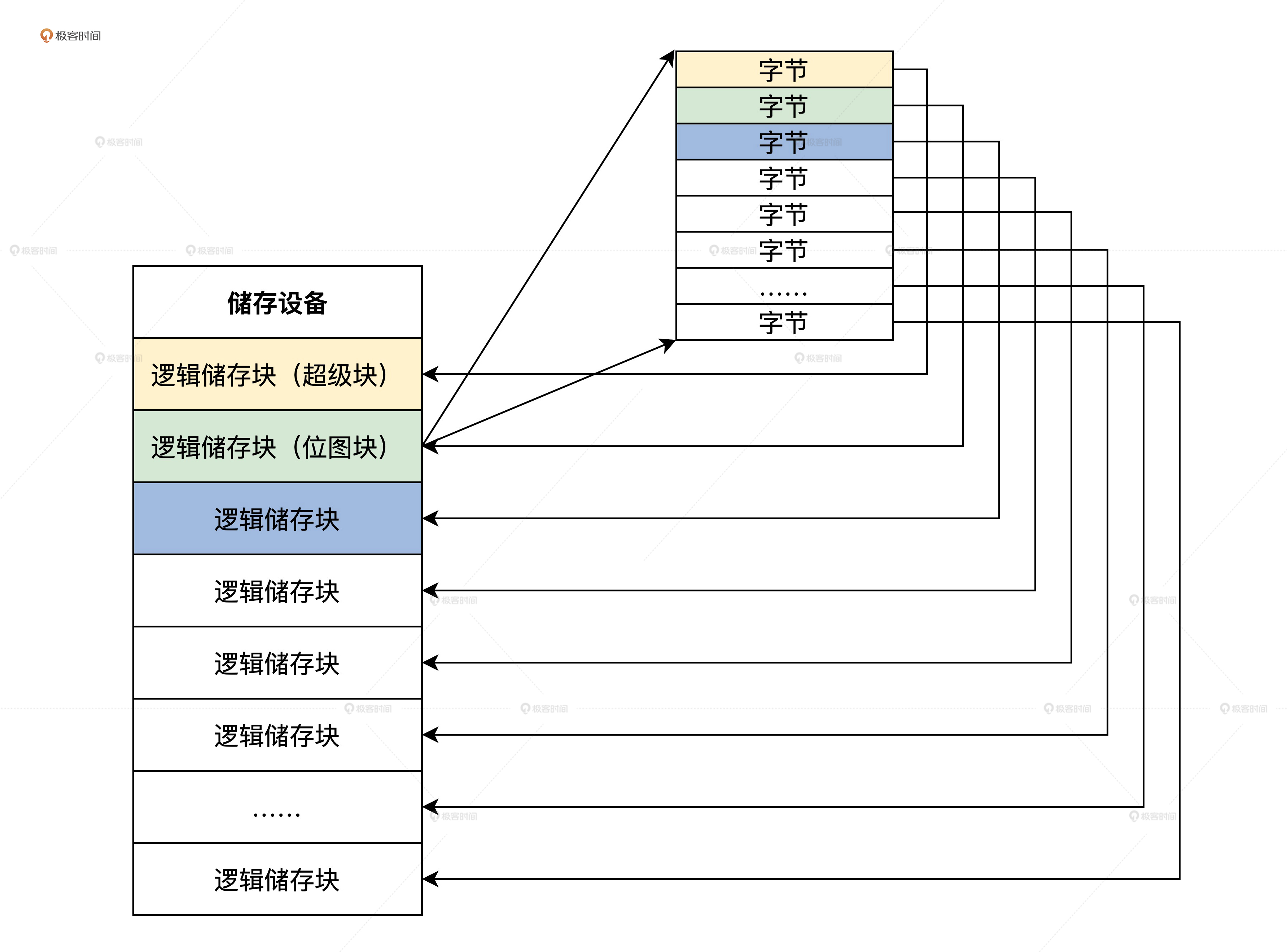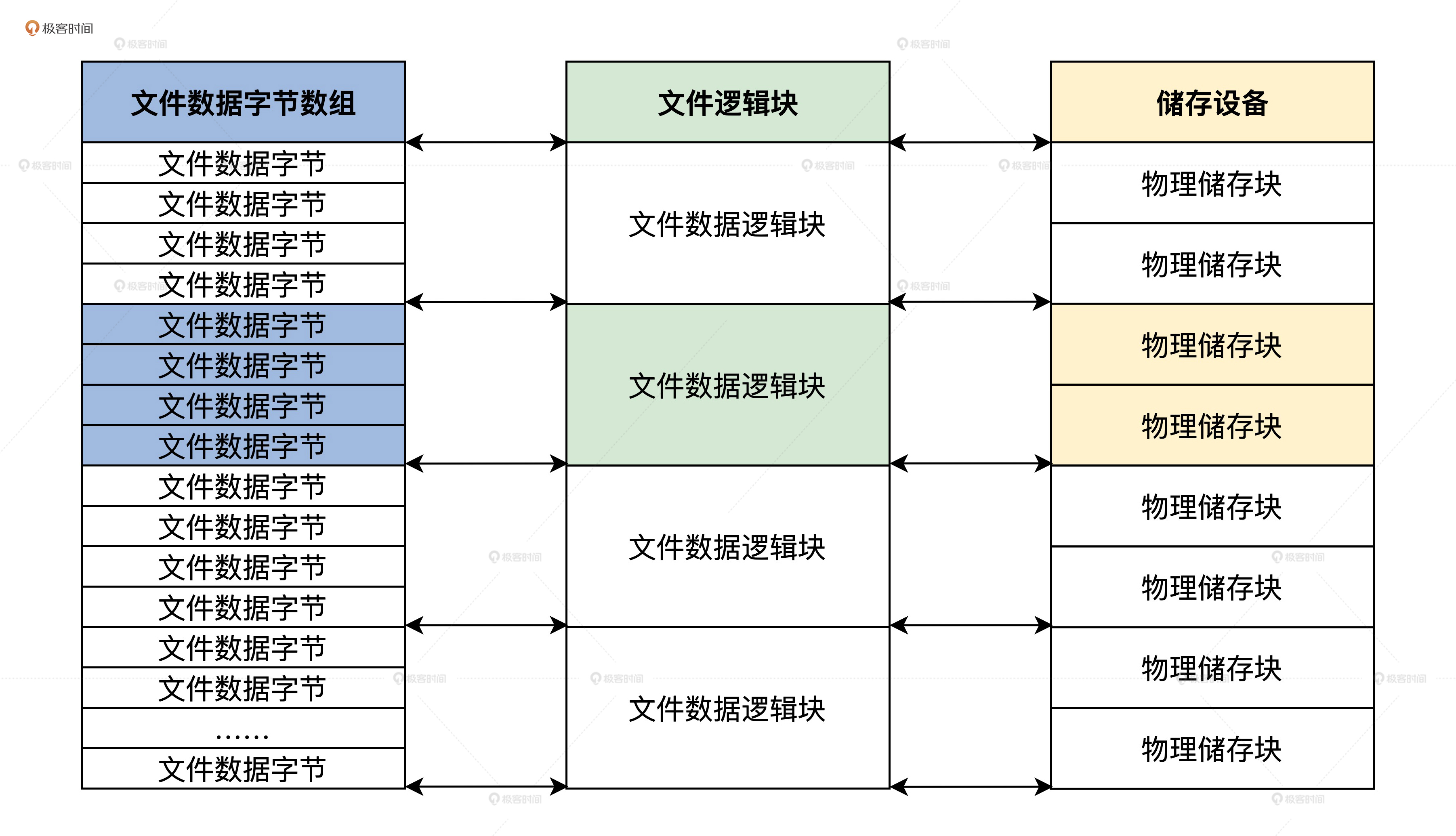 从这幅图里,我们可以看到从文件这个抽象概念,它是如何一步步从文件字节数组,整合形成文件数据逻辑块,最后映射到储存介质上的物理储存块。你需要先掌握整个演变过程的逻辑,具体怎么实现我们后面继续讲。