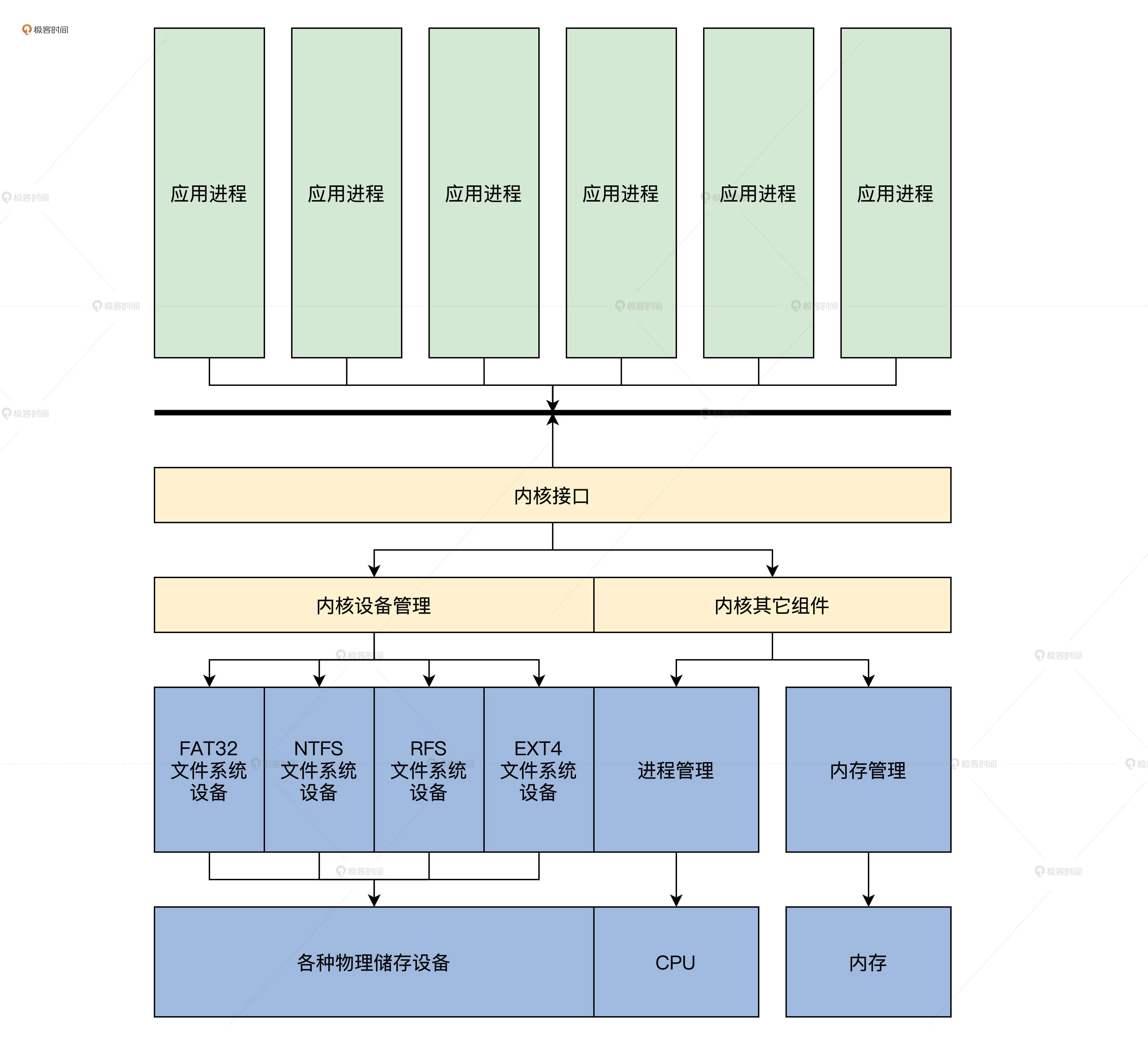 刚好前面的驱动模型中(第30节课),定义了文件系统的设备类型。这个架构我给你画一幅图,你看一下就明白了。