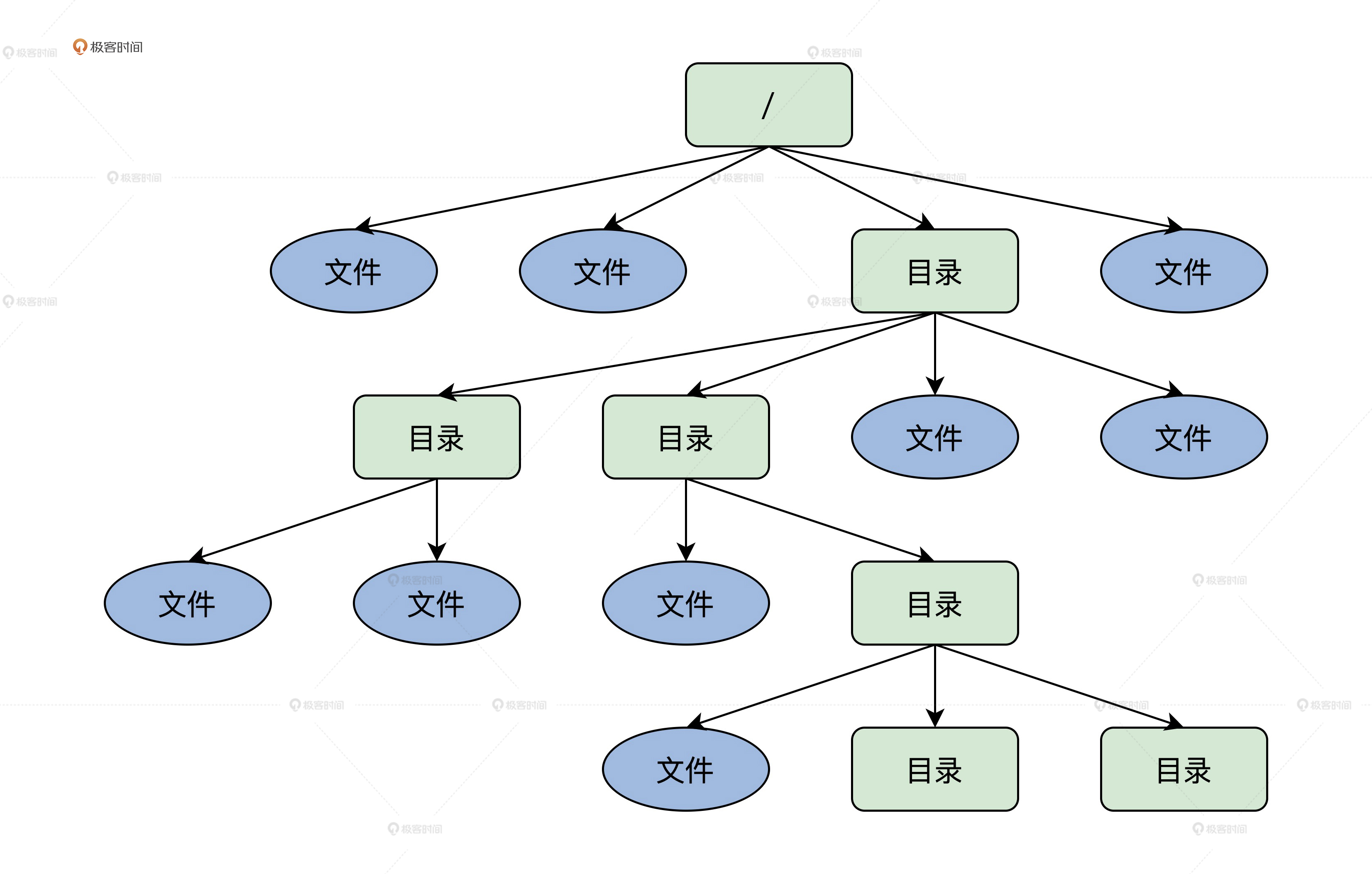 下图中就是典型的文件系统逻辑视图,从/(根)目录开始,就能找到每个文件、每个目录和每个目录下的所有文件。我们可以看出目录也是文件的一部分,它也扮演了“组织仓库管理员”的角色,可以对文件进行分层分类,以便用户对众多文件进行管理。