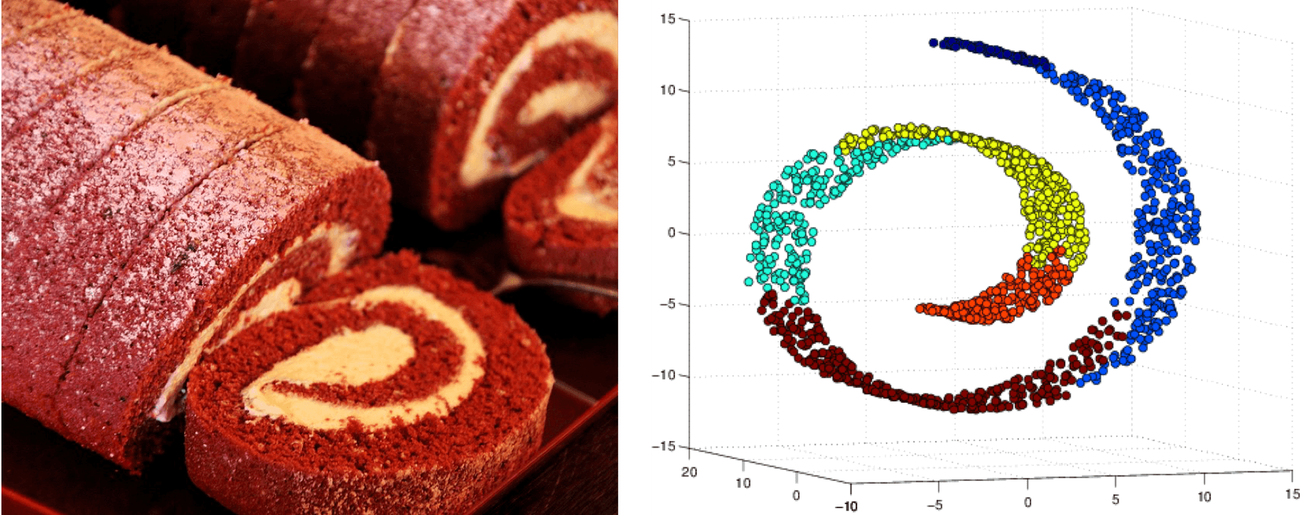 瑞士卷(左)与瑞士卷流形(右)示意图