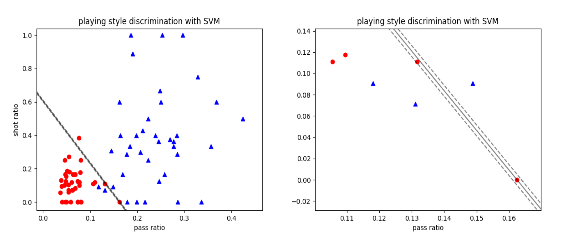 用于试验支持向量机的数据也来自英超,关注的焦点在于不同的比赛风格。传统的英式足球强调身体对抗、长传冲吊与高举高打,来自大陆和南美的拉丁派打法则偏重于对球的控制和精准传切,这两种不同的风格可以通过比赛数据直观体现出来。