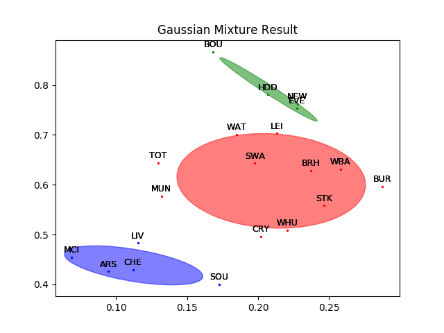 在Scikit-learn中,EM算法被内嵌在mixture模块中的GaussianMixture类中,调用这个类就调用了EM算法。用GaussianMixture类对20支英超球队的聚类数据进行分类,得到的结果如下图所示,其中不同的高斯分布用不同颜色的椭圆表示。可以看出,每个高斯分布都由相距较近的点组成。