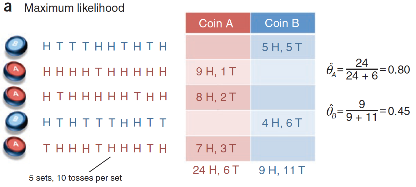 在上图的单次实验中,硬币\(A\)被抽到3次,30次投掷中出现了24次正面;硬币\(B\)被抽到2次,20次投掷中出现了9次正面。用最大似然估计可以计算出\(\\hat \\theta_A = 24 / (24 + 6) = 0.8, \\hat \\theta_B = 9 / (9 + 11) = 0.45\)。