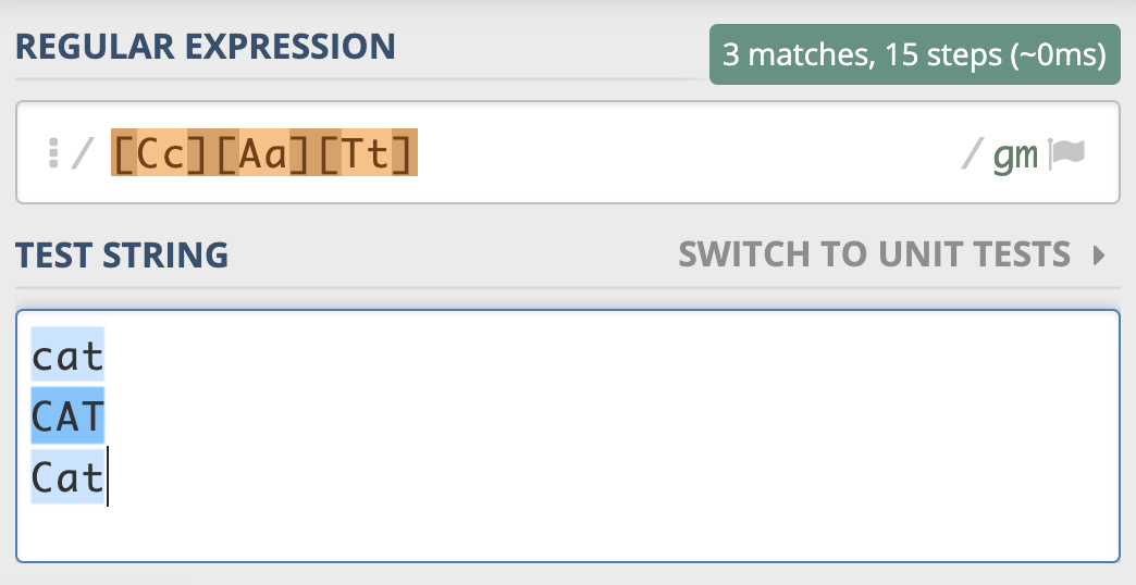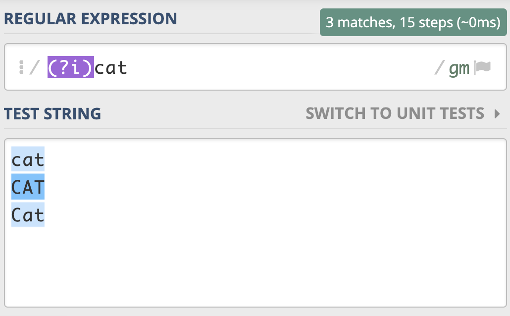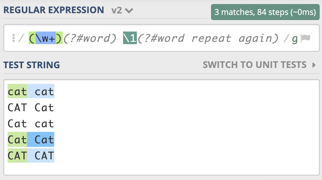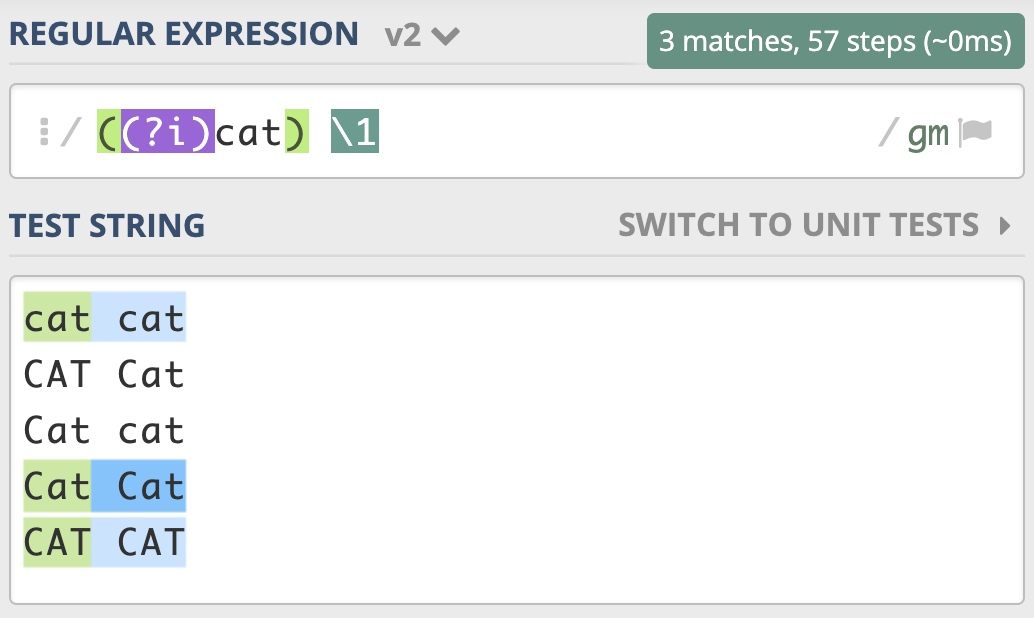 我们也可以用它来尝试匹配两个连续出现的 cat,如下图所示,你会发现,即便是第一个 cat 和第二个 cat 大小写不一致,也可以匹配上。