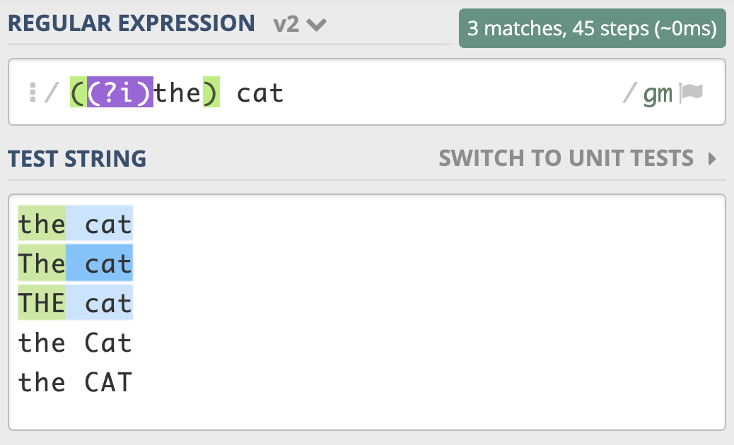 到这里,我们再进阶一下。如果用正则匹配,实现部分区分大小写,另一部分不区分大小写,这该如何操作呢?就比如说我现在想要,the cat 中的 the 不区分大小写,cat 区分大小写。