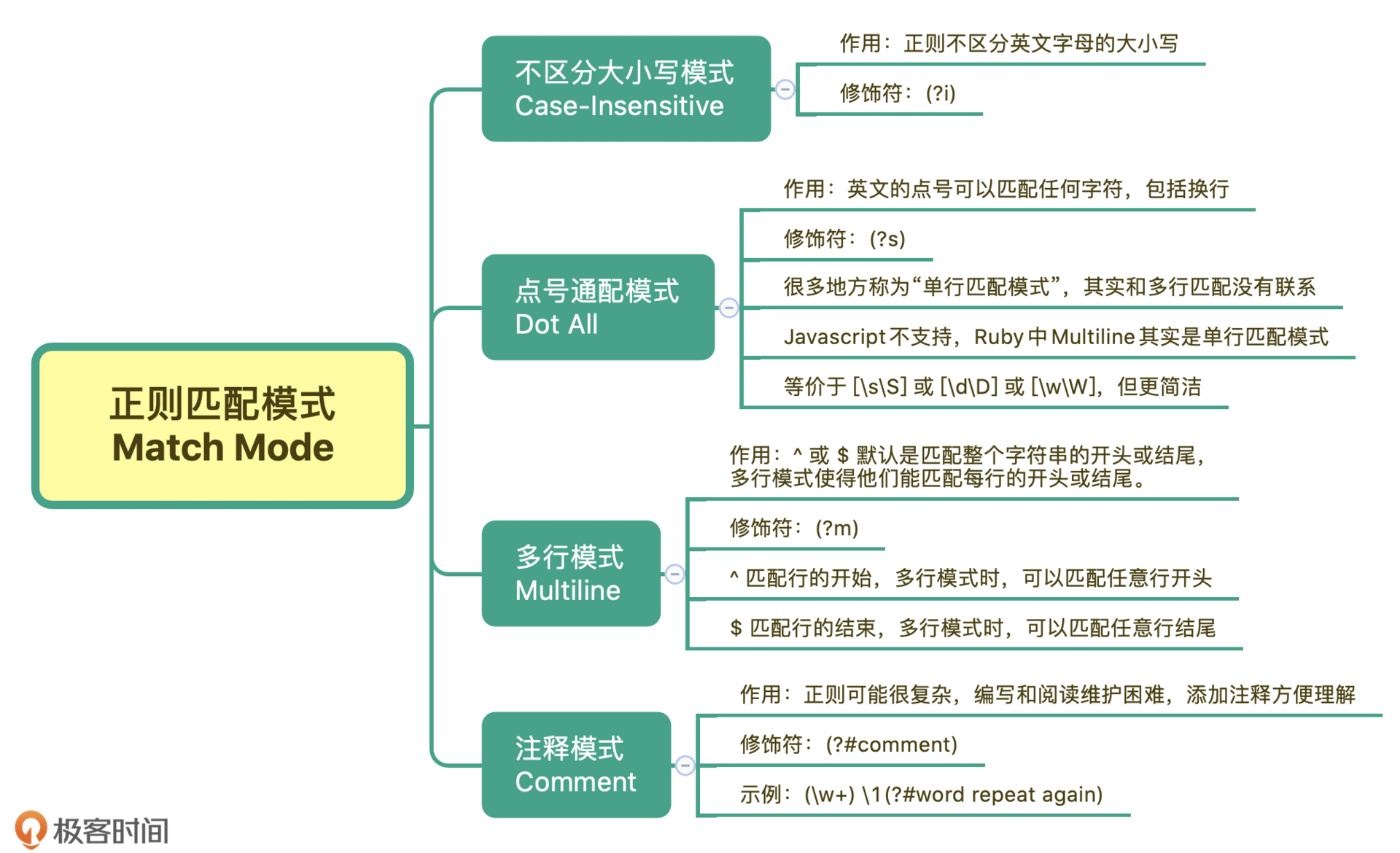 最后,我来给你总结一下,正则中常见的四种匹配模式,分别是:不区分大小写、点号通配模式、多行模式和注释模式。
