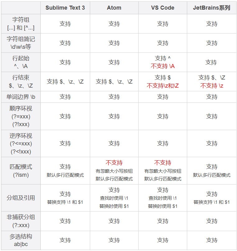 这里给出一些主流跨平台编辑器/IDE对正则的支持情况,你可以参考一下。