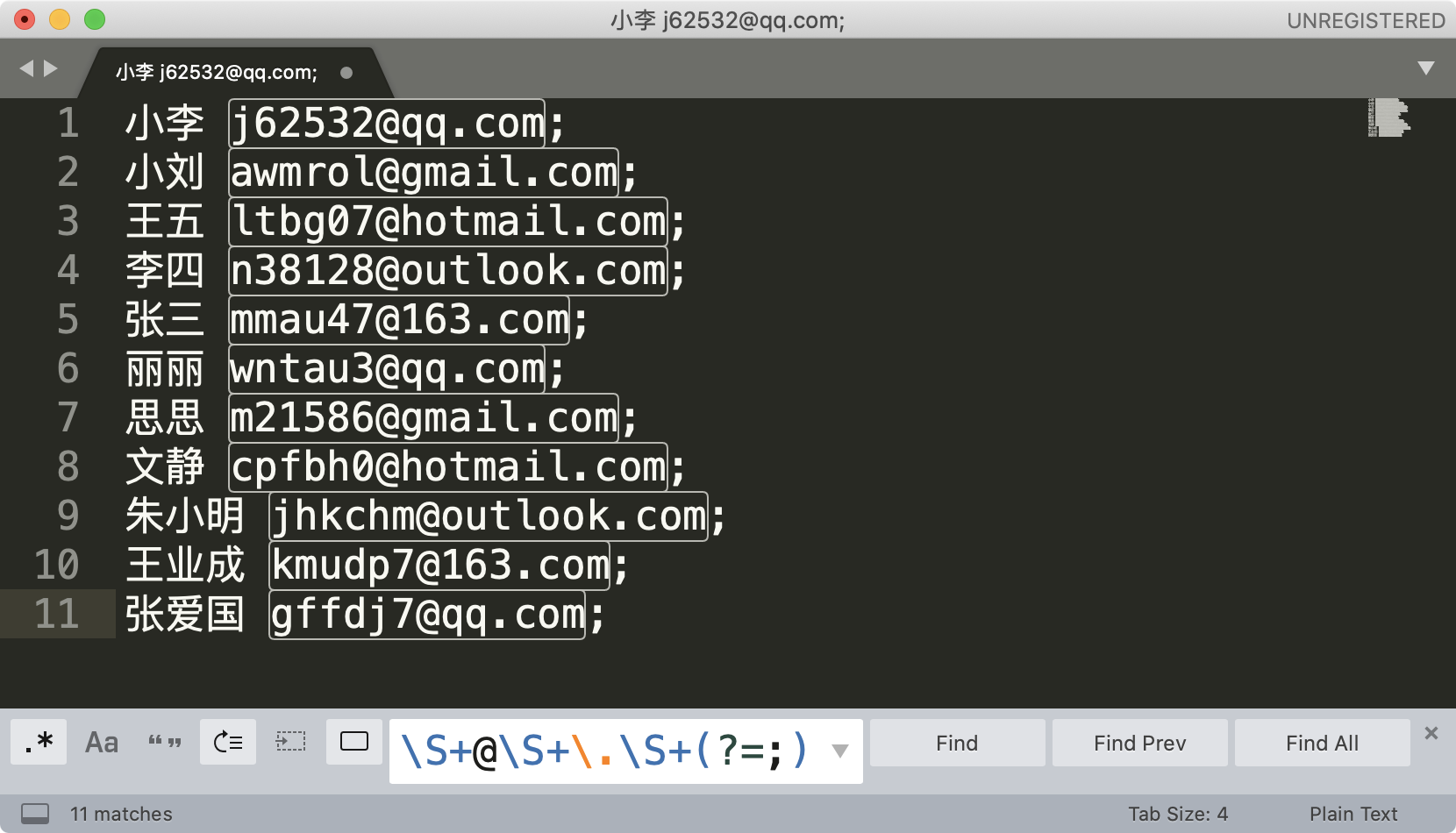 我们来尝试使用 sublime 提取文本中所有的邮箱地址,这里并不要求你写出一个完美的正则,因此演示时,使用\S+@\S+.\S+ 这个正则。另外我们可以加上环视,去掉尾部的分号。你可以在这里随机生成一些邮箱用于测试。
