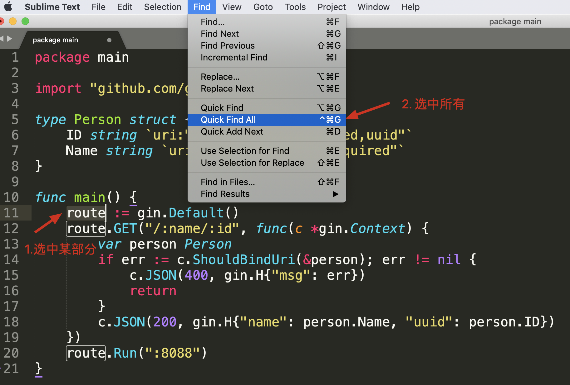 比如选择单词 route 之后,点击菜单 Find -> Quick Find All 就可以选中所有的 route 了。你可以进行多焦点编辑,非常方便。我给了你一个测试文本,你可以点击这里获取。