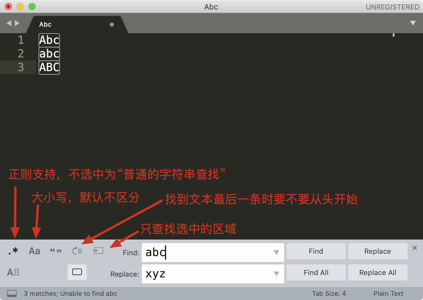 我以编辑器 Sublime Text 3 为例来进行讲解,下图是编辑器 Sublime Text 查找界面的介绍。