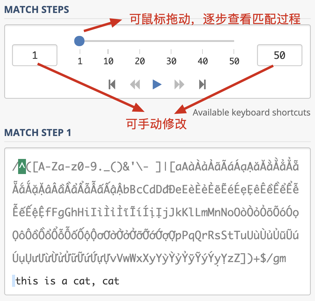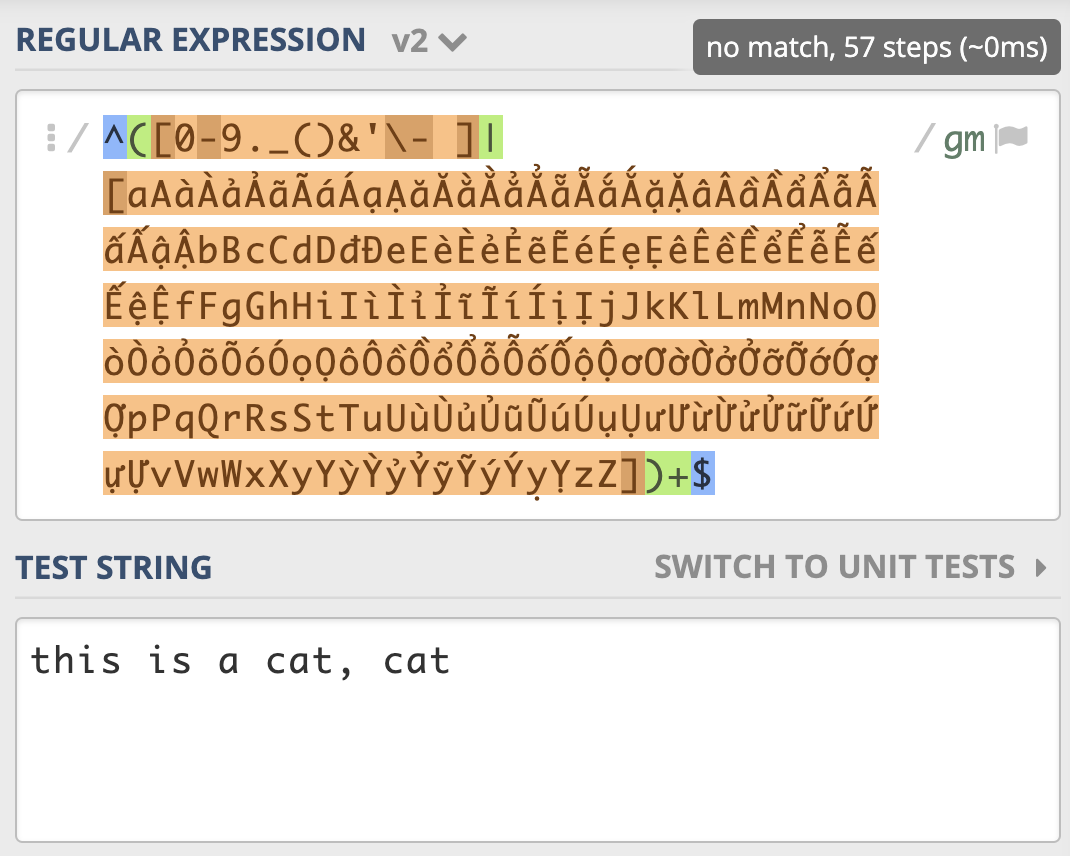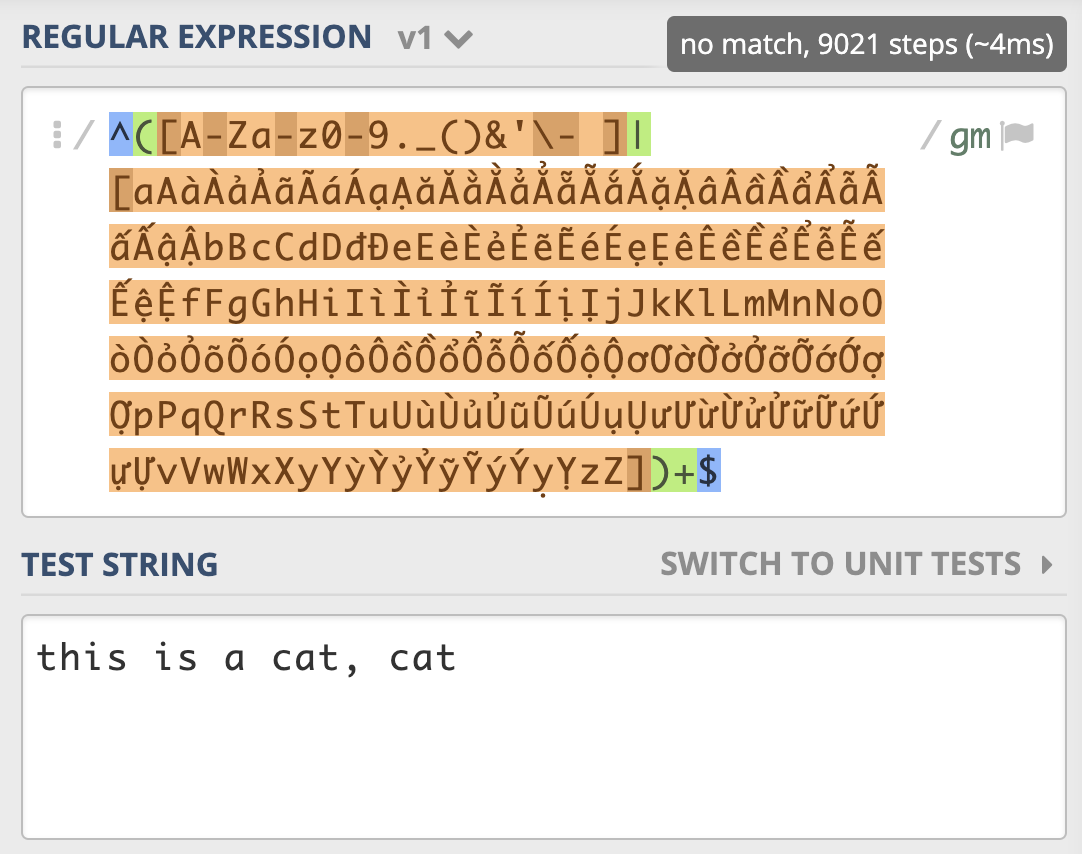 从示例我们可以看到,一个很短的字符串,NFA引擎尝试步骤达到了 9021 次,由于是贪婪匹配,第一个分支能匹配上 this is a cat 部分,接着后面的逗号匹配失败,使用第二个分支匹配,再次失败,此时贪婪匹配部分结束。NFA引擎接着用正则后面的 $ 来进行匹配,但此处不是文本结尾,匹配不上,发生回溯,吐出第一个分支匹配上的 t,使用第二个分支匹配 t 再试,还是匹配不上。