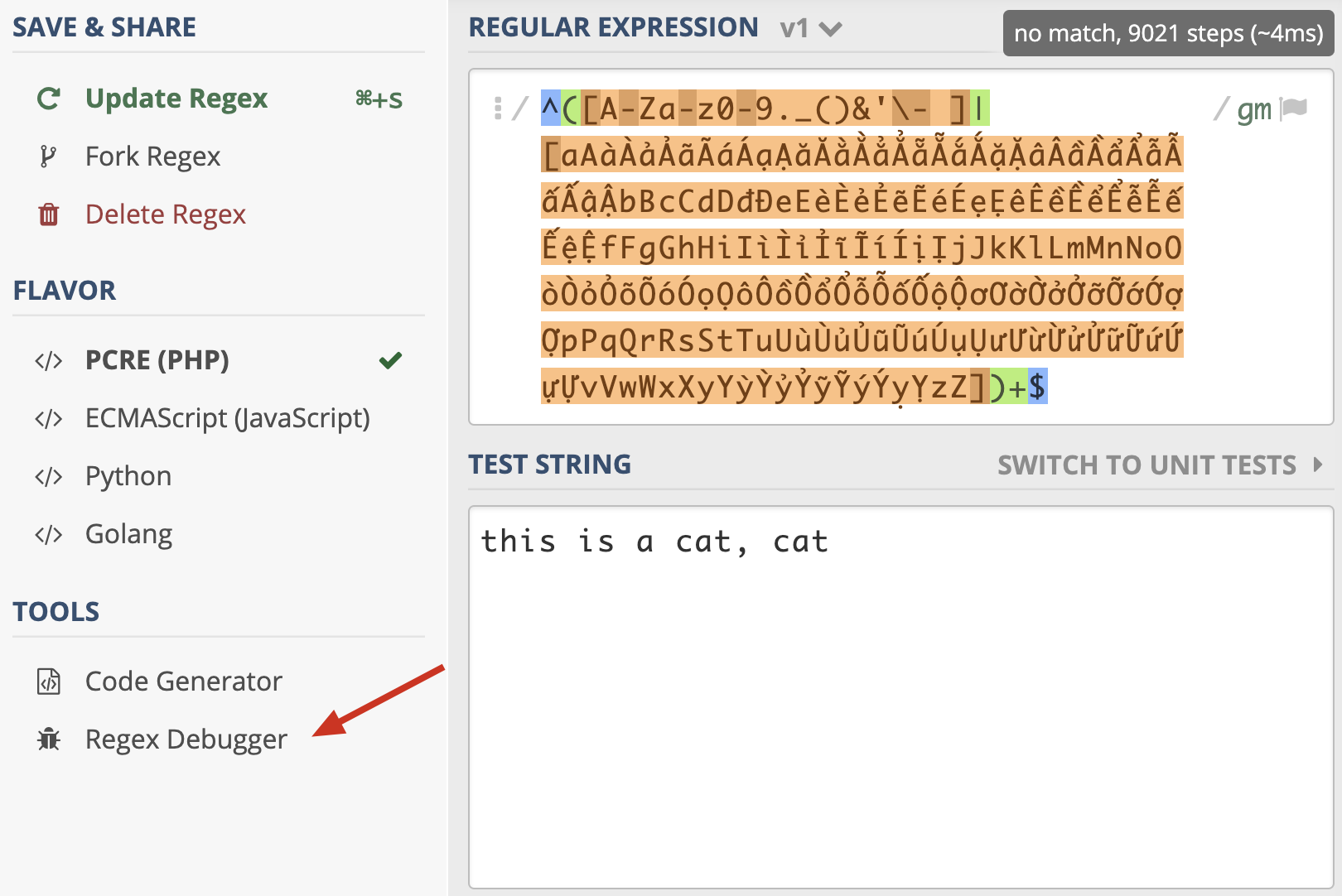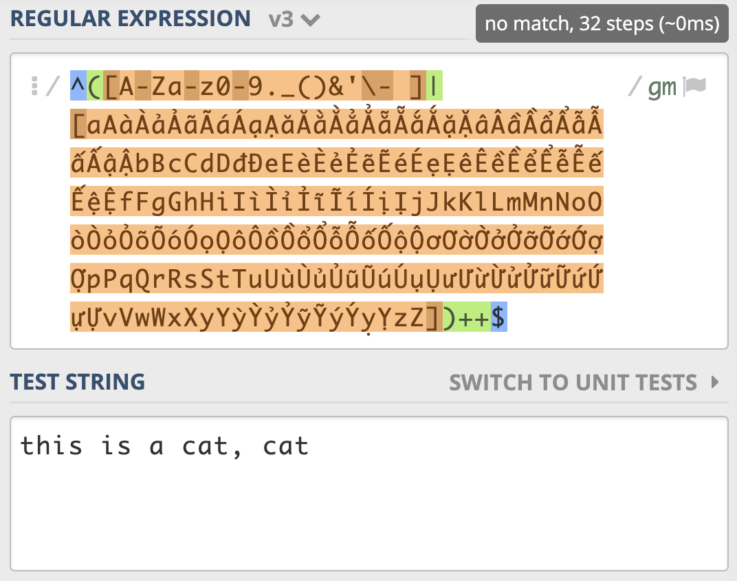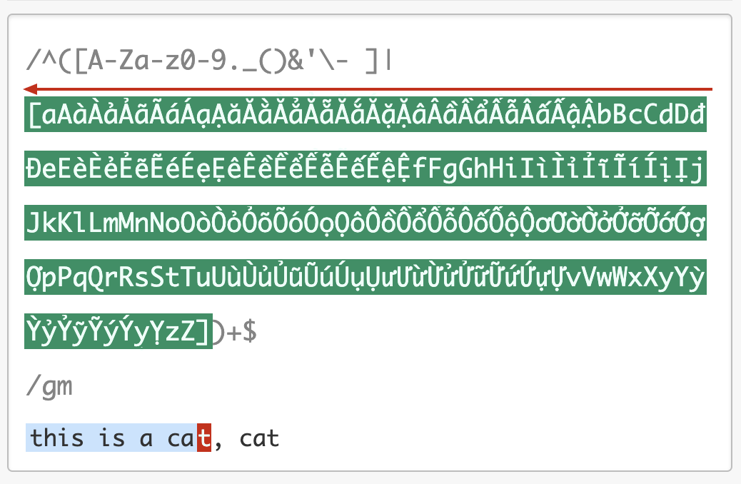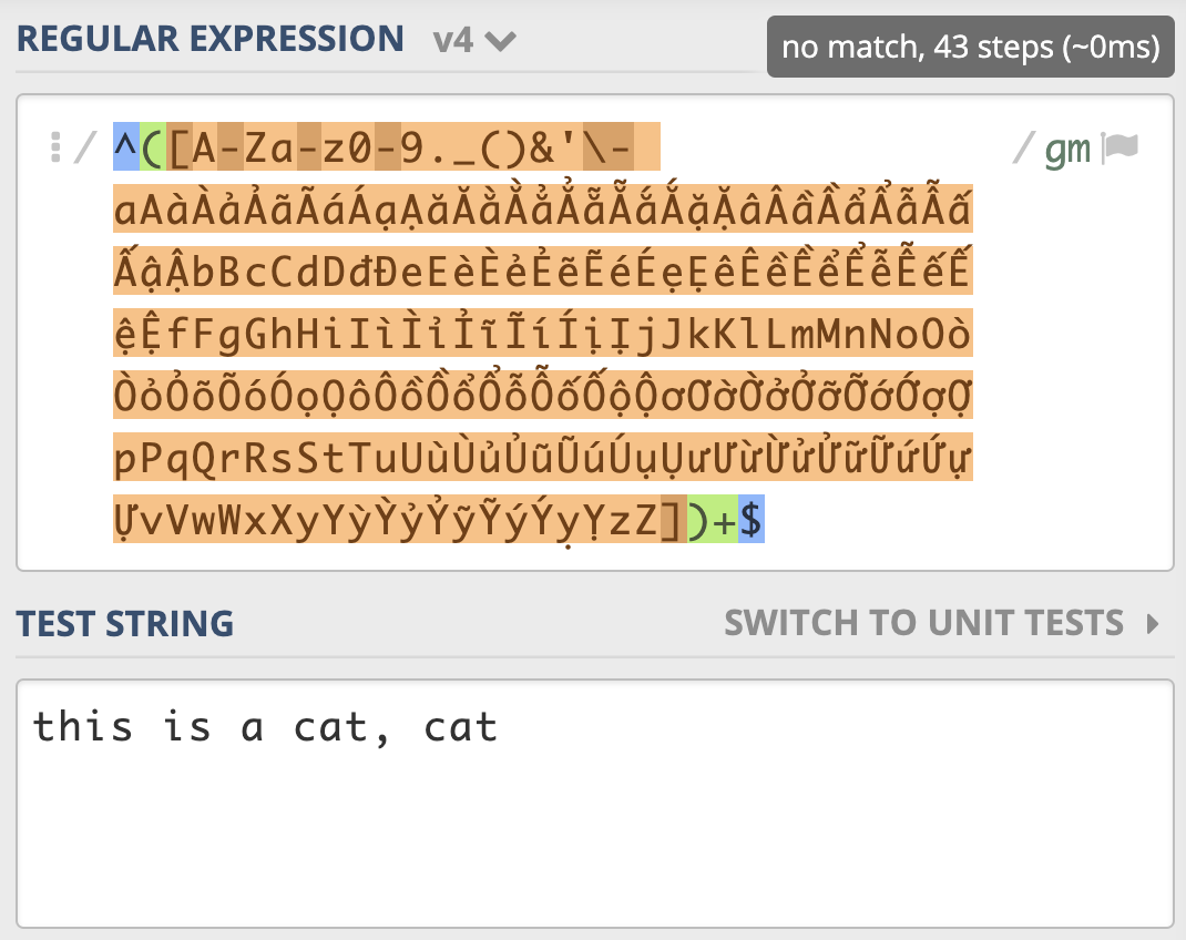 从示例我们可以看到,一个很短的字符串,NFA引擎尝试步骤达到了 9021 次,由于是贪婪匹配,第一个分支能匹配上 this is a cat 部分,接着后面的逗号匹配失败,使用第二个分支匹配,再次失败,此时贪婪匹配部分结束。NFA引擎接着用正则后面的 $ 来进行匹配,但此处不是文本结尾,匹配不上,发生回溯,吐出第一个分支匹配上的 t,使用第二个分支匹配 t 再试,还是匹配不上。
