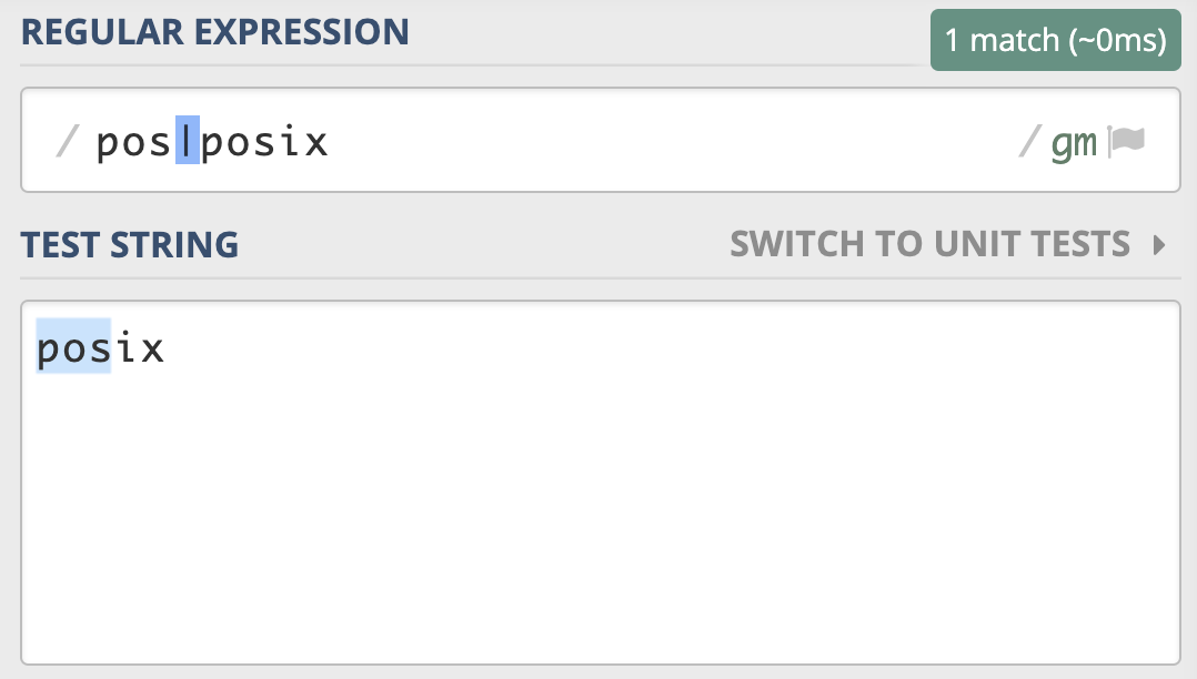 POSIX NFA的应用很少,主要是 Unix/Linux 中的某些工具。POSIX NFA 引擎与传统的 NFA 引擎类似,但不同之处在于,POSIX NFA 在找到可能的最长匹配之前会继续回溯,也就是说它会尽可能找最长的,如果分支一样长,以最左边的为准(“The Longest-Leftmost”)。因此,POSIX NFA 引擎的速度要慢于传统的 NFA 引擎。