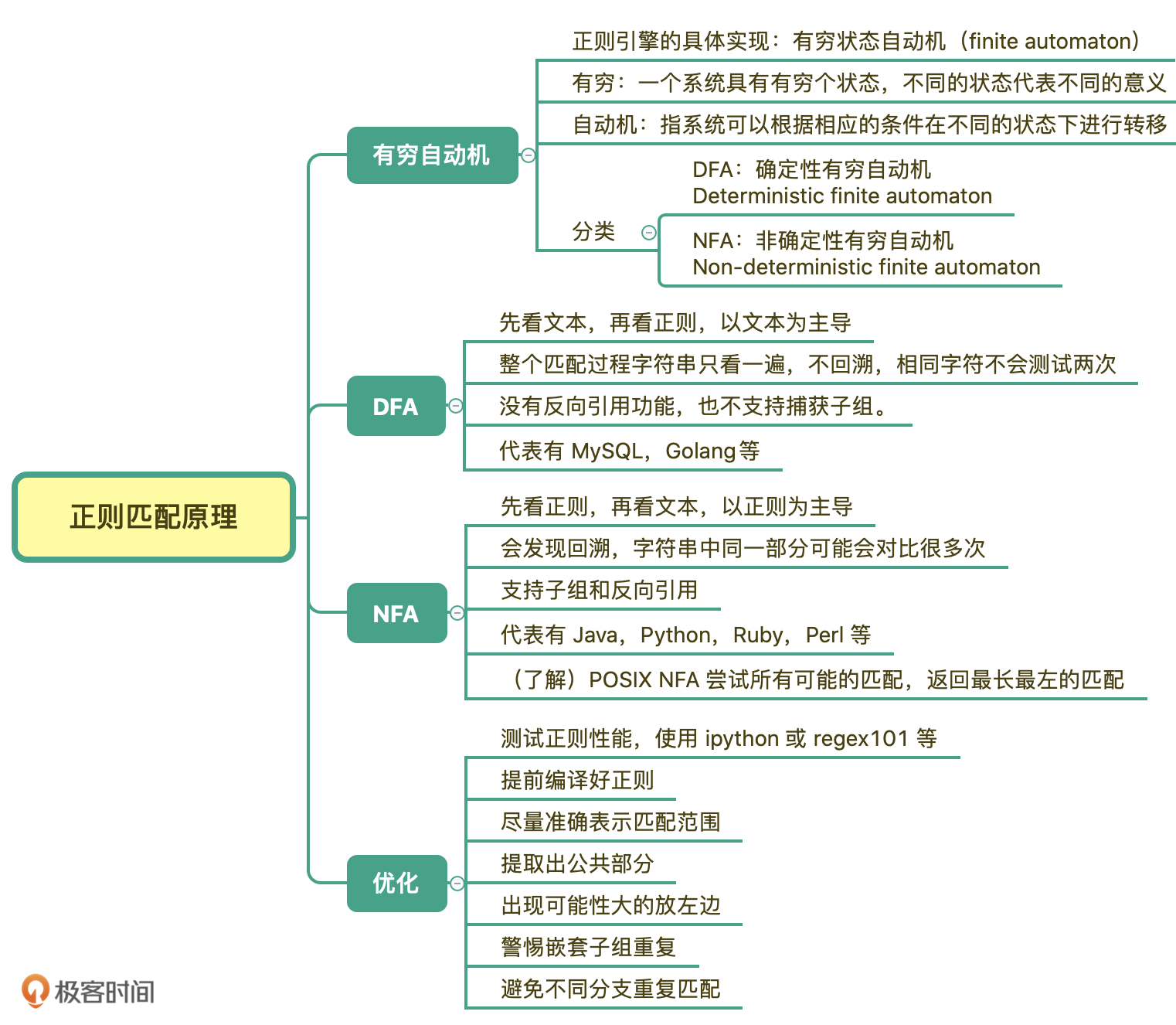 从这个示例你可以看到,DFA 和 NFA 两种引擎的工作方式完全不同。NFA 是以表达式为主导的,先看正则表达式,再看文本。而 DFA 则是以文本为主导,先看文本,再看正则表达式。