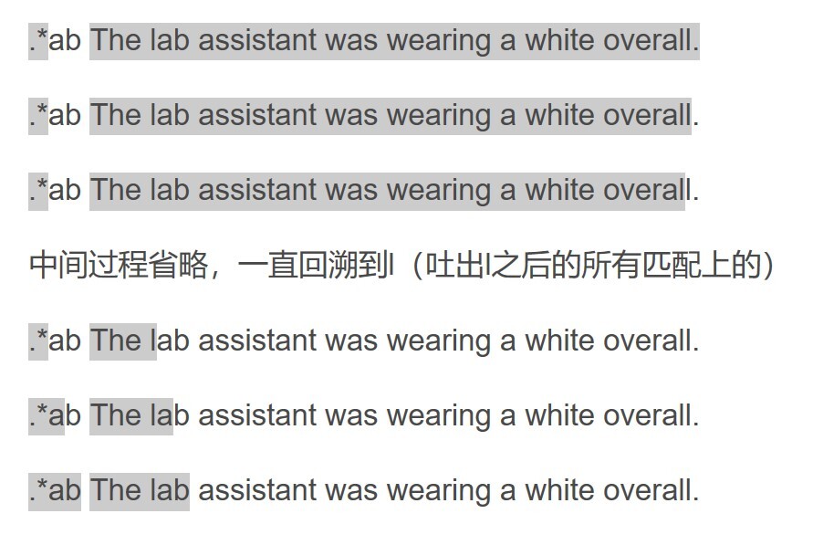 如果正则是使用 .*ab 去匹配一个比较长的字符串就更糟糕了,因为 .* 会吃掉整个字符串(不考虑换行,假设文本中没有换行),然后,你会发现正则中还有 ab 没匹配到内容,只能将 .* 匹配上的字符串吐出一个字符,再尝试,还不行,再吐出一个,不断尝试。-