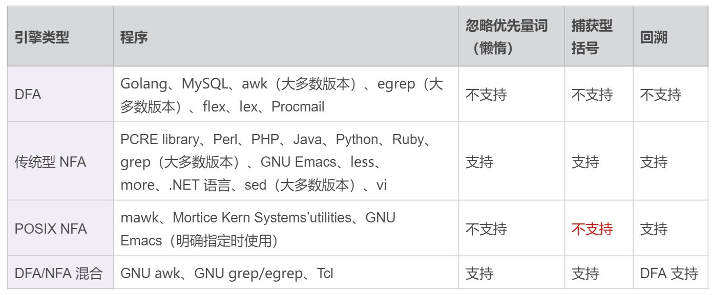 下面是 DFA、传统NFA 以及 POSIX NFA 引擎的特点总结:
