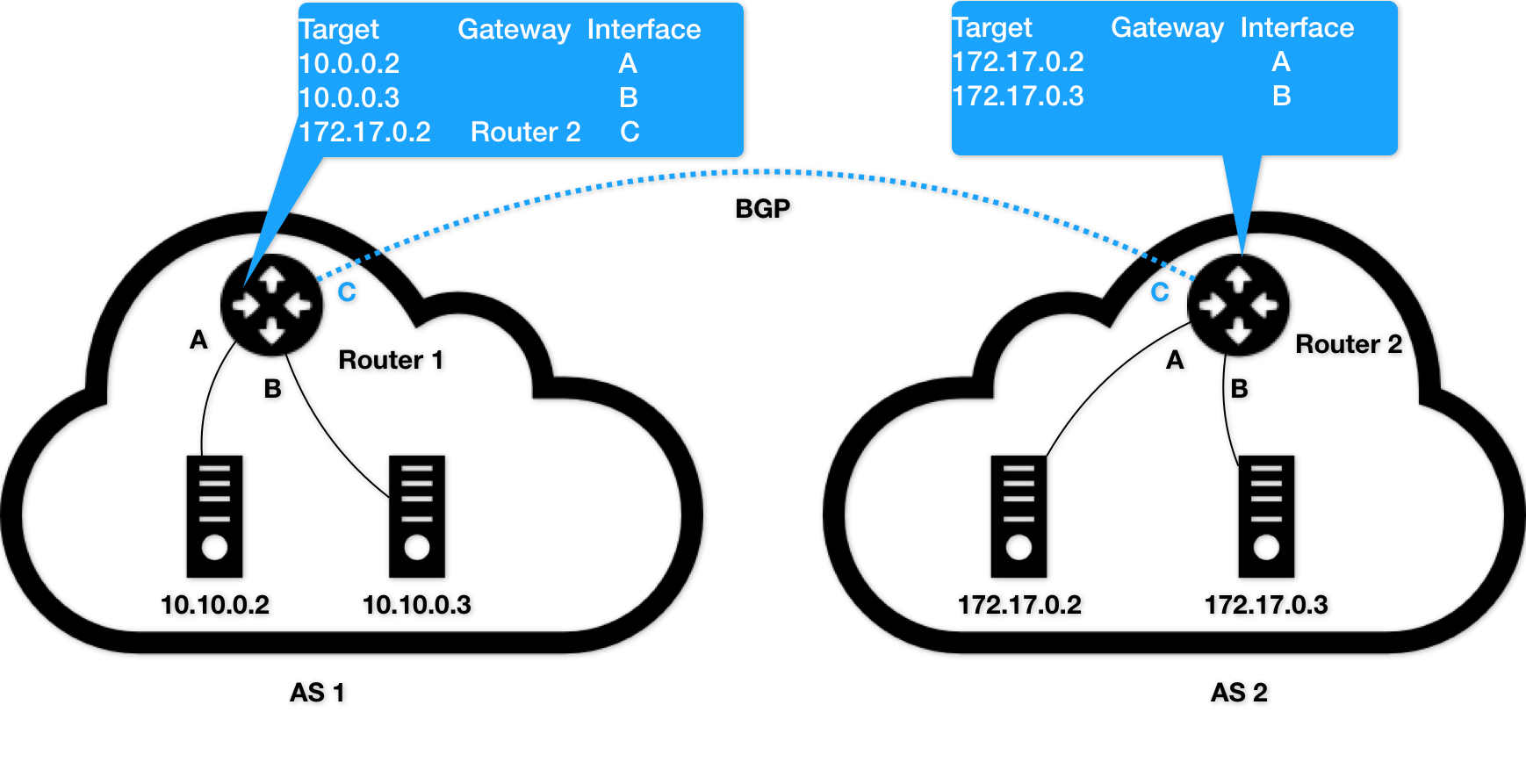 而在此时,Router 1的路由表里,有这样一条规则,即:目的地址是172.17.0.2包,应该经过Router 1的C接口,发往网关Router 2(即:自治系统AS 2上的路由器)。
