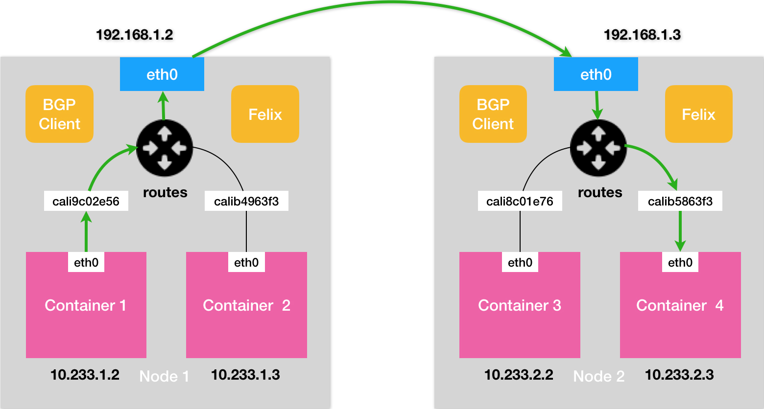 这样,原先从容器到Node 2的IP包,就被伪装成了一个从Node 1到Node 2的IP包。