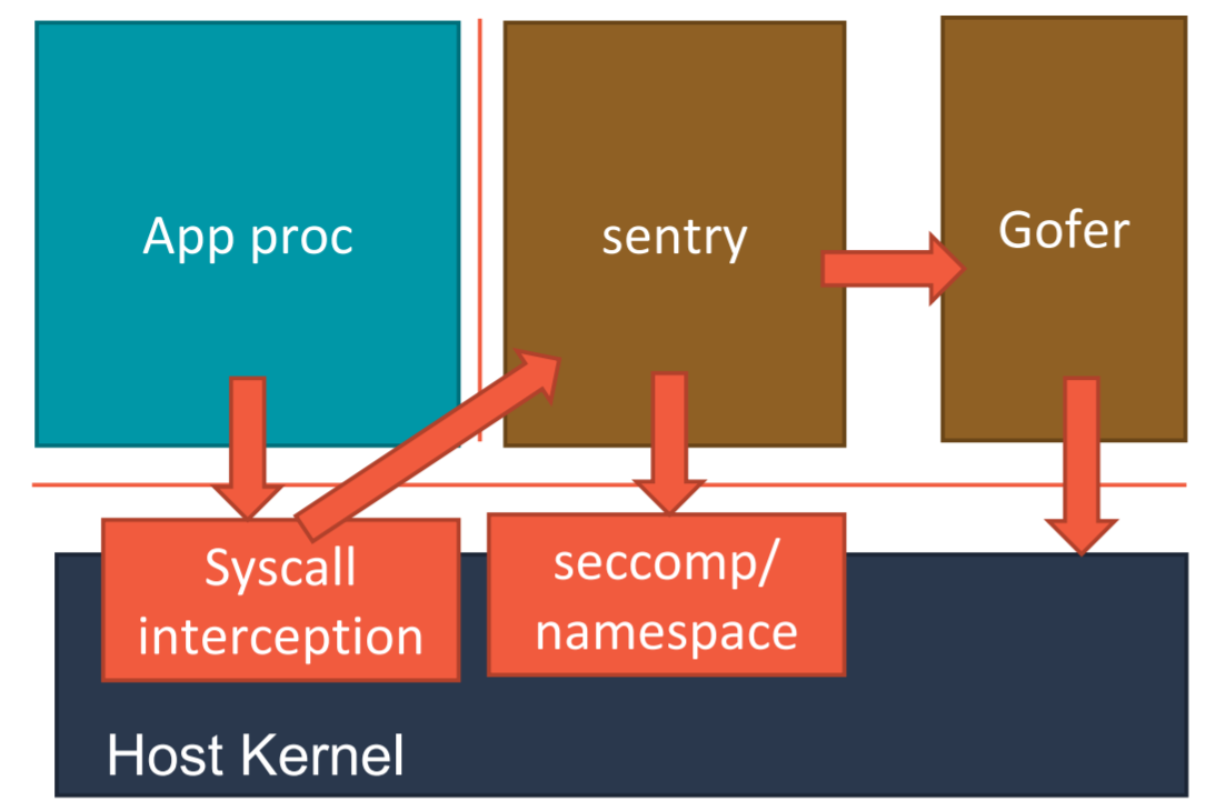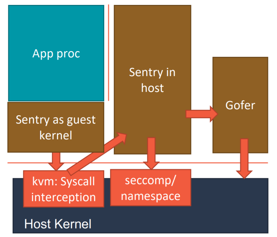 在这种实现里,Sentry 会使用 KVM 来进行系统调用的拦截,这个性能比 Ptrace 就要好很多了。