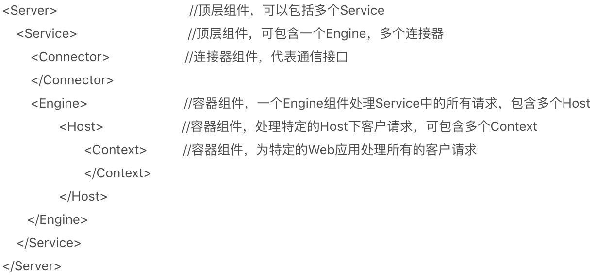 你可以再通过Tomcat的server.xml配置文件来加深对Tomcat容器的理解。Tomcat采用了组件化的设计,它的构成组件都是可配置的,其中最外层的是Server,其他组件按照一定的格式要求配置在这个顶层容器中。