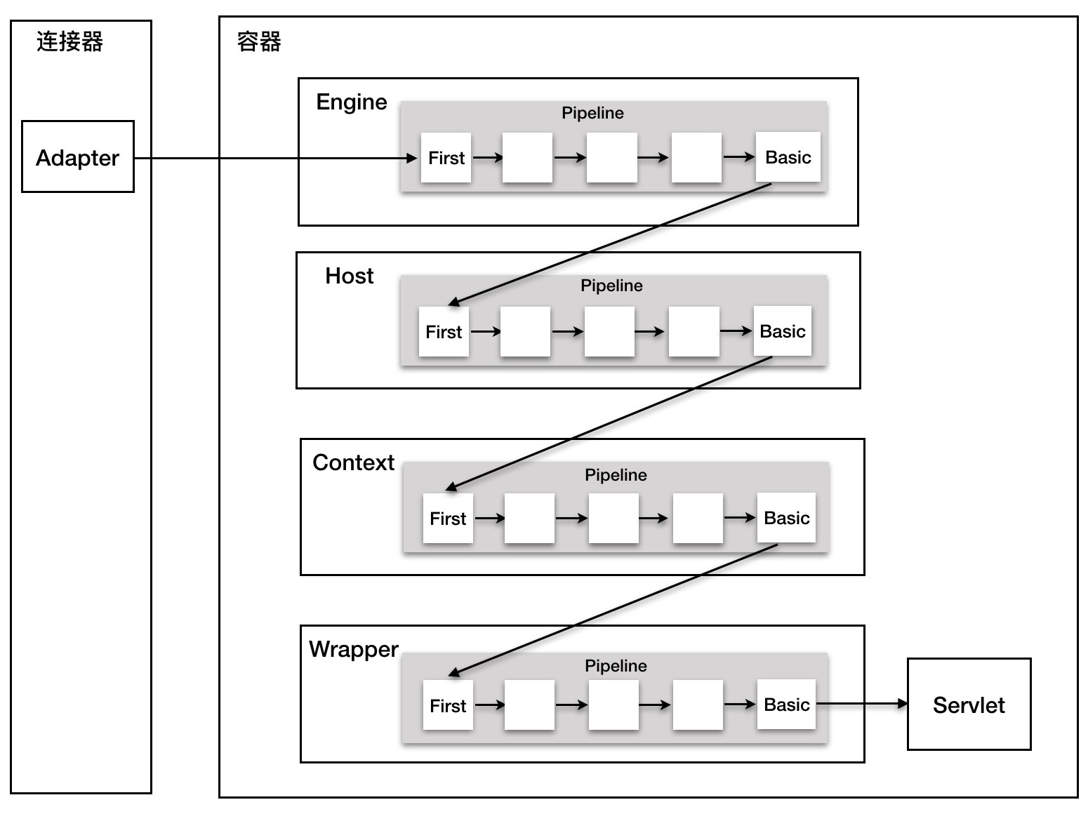 这是因为Pipeline中还有个getBasic方法。这个BasicValve处于Valve链表的末端,它是Pipeline中必不可少的一个Valve,负责调用下层容器的Pipeline里的第一个Valve。我还是通过一张图来解释。