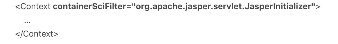 • 如果你的项目没有使用JSP作为Web页面模板,而是使用Velocity之类的模板引擎,你完全可以把TLD扫描禁止掉。方法是,找到Tomcat的conf/目录下的context.xml文件,在这个文件里Context标签下,加上JarScannerJarScanFilter子标签,像下面这样。