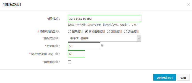 我们再设置一下非常重要的伸缩规则,这会告诉伸缩组何时进行自动扩缩容。这里我们选择监控平均CPU指标,我们希望理想状态下控制在50%左右。换句话说,如果平均CPU偏离50%太远,系统就会自动地为我们增加或减少机器。