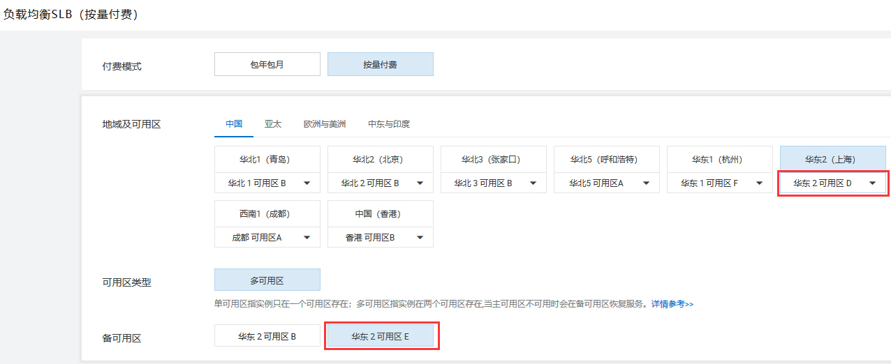 为了让之后的外部流量能够进入到内部网络的多台虚拟机中,我们来建立对外的负载均衡实例。要注意,负载均衡器本身也需要是高可用的,我们这里主要选择华东2区域下的可用区D,让可用区E作为备可用区,和我们的VPC保持一致。