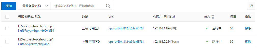回到最佳拍档负载均衡的管理界面,我们也看到弹性伸缩组中的两台机器,已经位于后端服务器列表中了(这时可以将测试机vm1-in-vpc1从后端服务中删去):