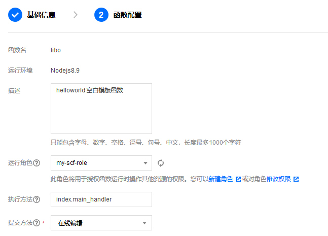 然后,我们简单地填写描述,并选取云函数所运行的角色(角色定义了云函数的一些访问权限,如是否能够访问对象存储等),然后选择“完成”即可创建函数。