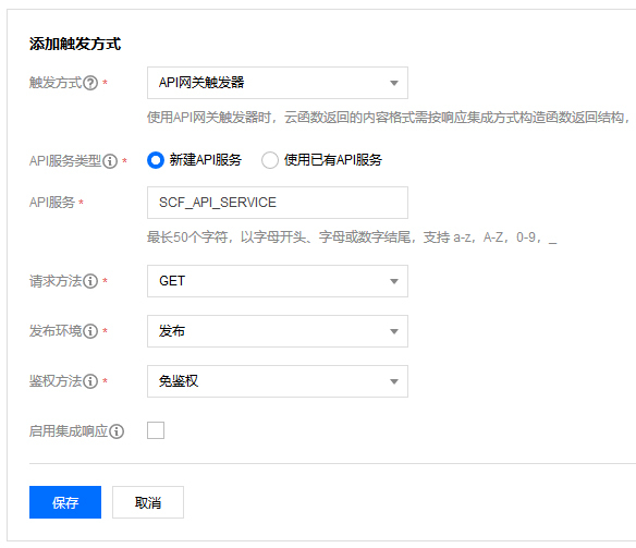 为了让这个云函数能够对外服务,我们接下来就需要为它添加一个API网关触发器,这样当API被外界访问时,这个云函数就会被触发执行并返回结果给网关。
