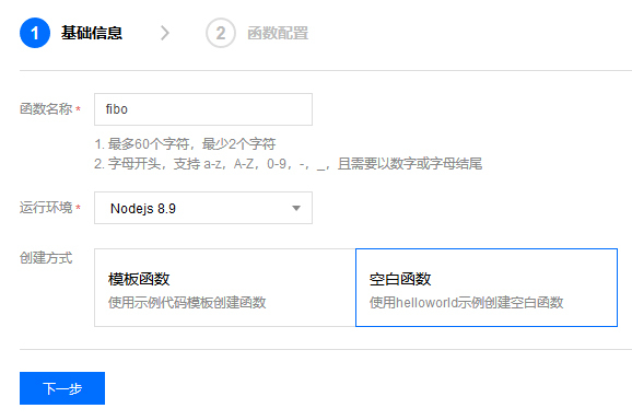首先,我们来到腾讯云的云函数产品中,在函数服务菜单下选择“新建”。这里需要填写一下函数名称,我们命名为fibo,然后运行环境选择Node.js。