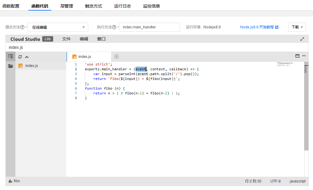 另外,这里你需要注意的是重要的输入参数event,因为以后具体访问请求的详细信息,就会体现在这个event参数的各个字段中。这里我们主要取出path字段,来获得fibo函数输入参数n的值。