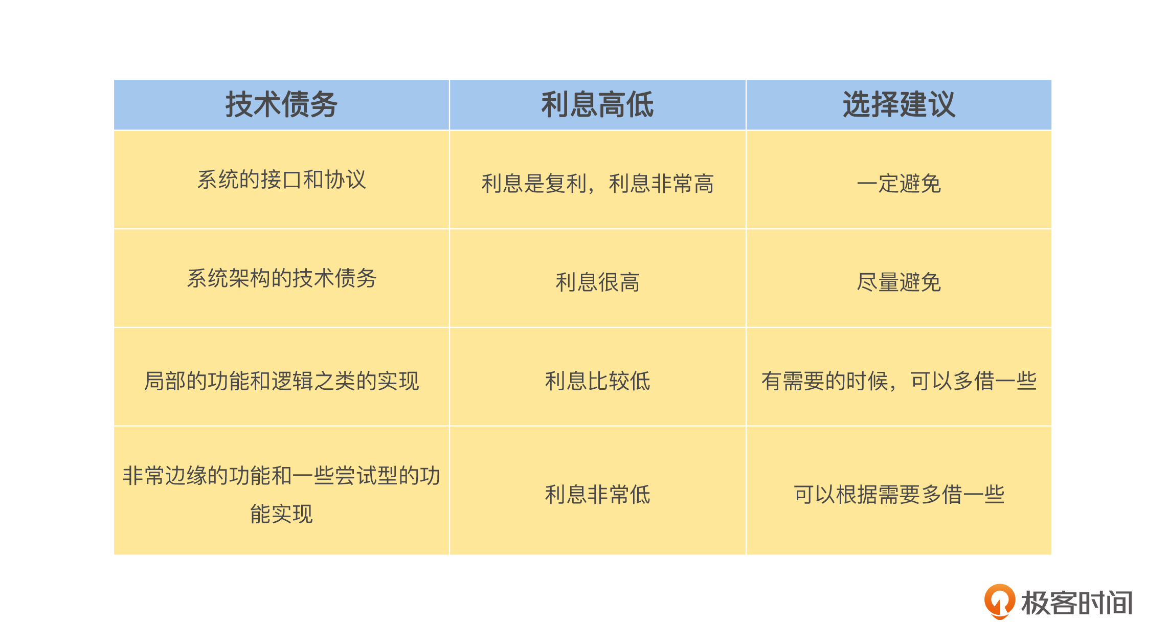 既然技术债务是债务,那么借技术债务也是有利息的,所以我们在借技术债务的时候,要深思熟虑,区分哪些地方的技术债务是高利息的,甚至是复利,而哪些地方的技术债务是低利息的,甚至有些地方的技术债务可能都是不需要还的。