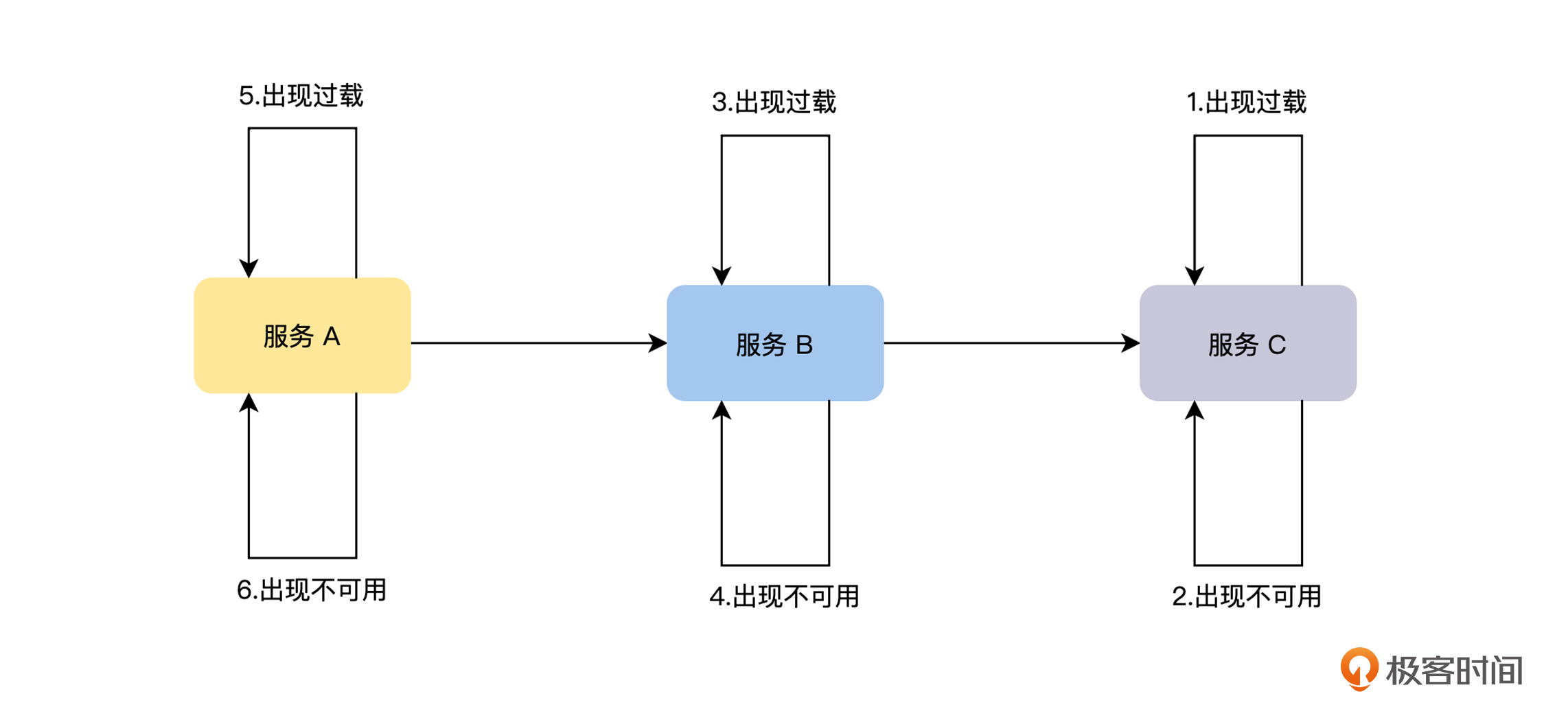 最后,由于服务内部出现严重的过载,导致响应严重超时,服务的调用方同样会出现大量请求的积压使资源耗尽,这样正反馈循环就形成了,故障沿着调用链路逆向传播,导致整个系统出现雪崩。