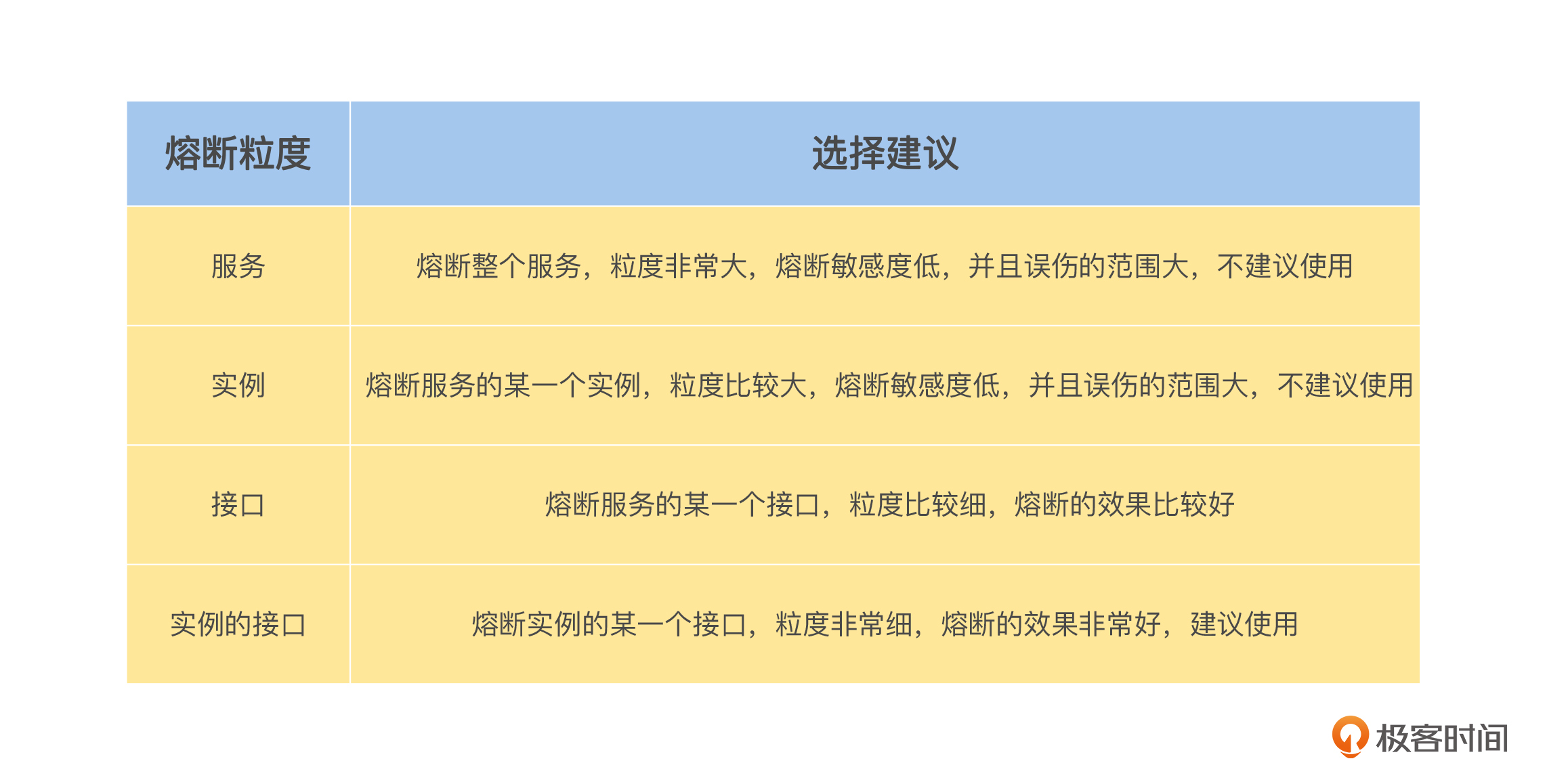 结合我的工作经验,在实现熔断机制的时候,更建议你选择“实例的接口”这个熔断粒度,主要有以下三个原因。