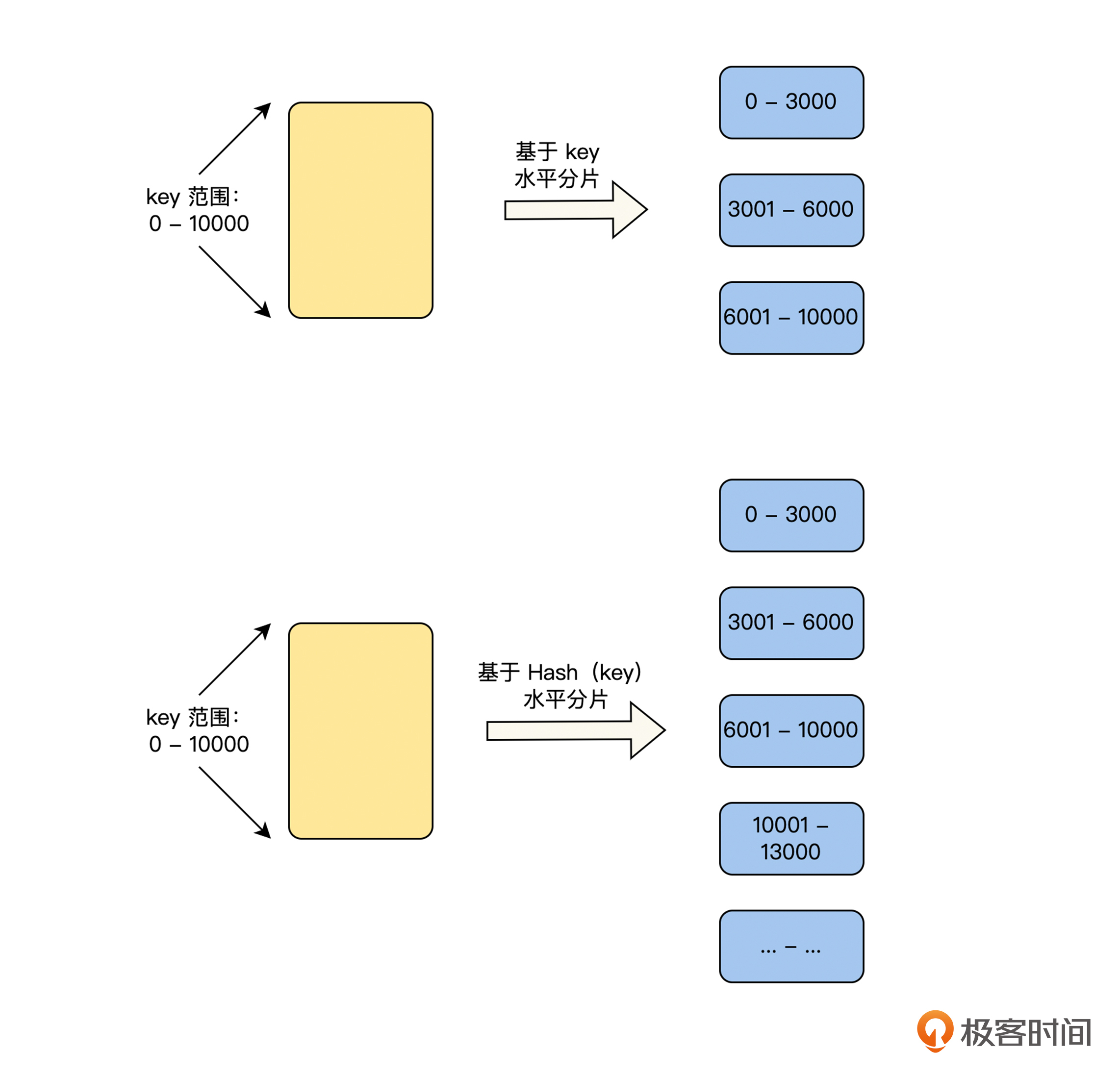 数据划分要解决的问题是,将整个数据空间划分为多个分片空间,它主要有两种方式,基于模运算划分和基于范围划分。基于模运算的划分,在“负载均衡”篇中 Hash 负载均衡策略的部分充分介绍过了,这里不再重复。下面我们重点介绍基于范围的划分,如下图所示,它分为基于关键词划分和基于关键词的 Hash 值划分两种方式。